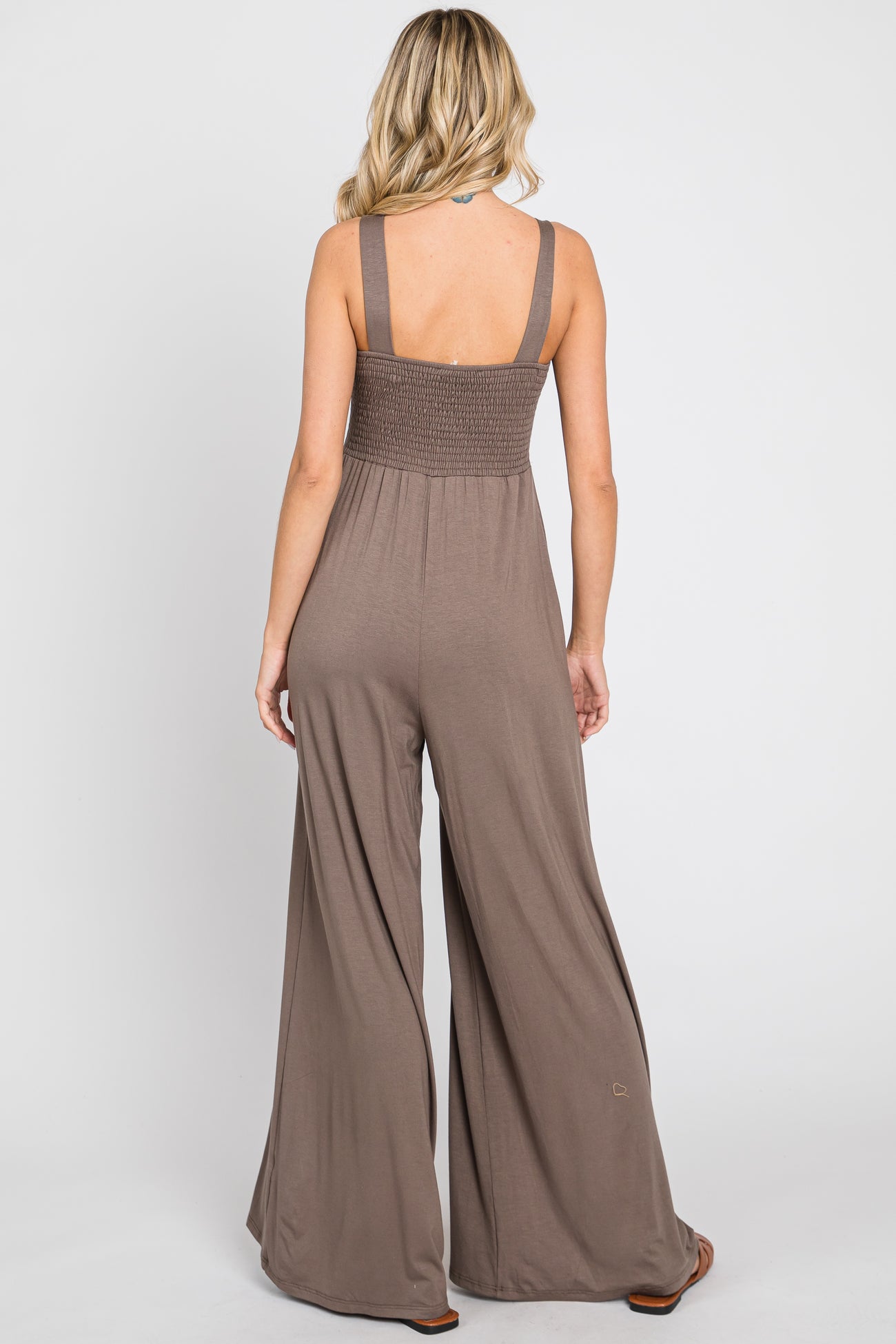 A sleeveless jumpsuit featuring a smocked bust, side pockets and wide legs.