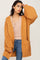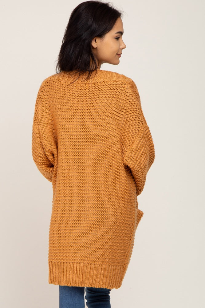 A cable knit cardigan with an open front, long balloon sleeves, and front pockets.
