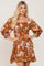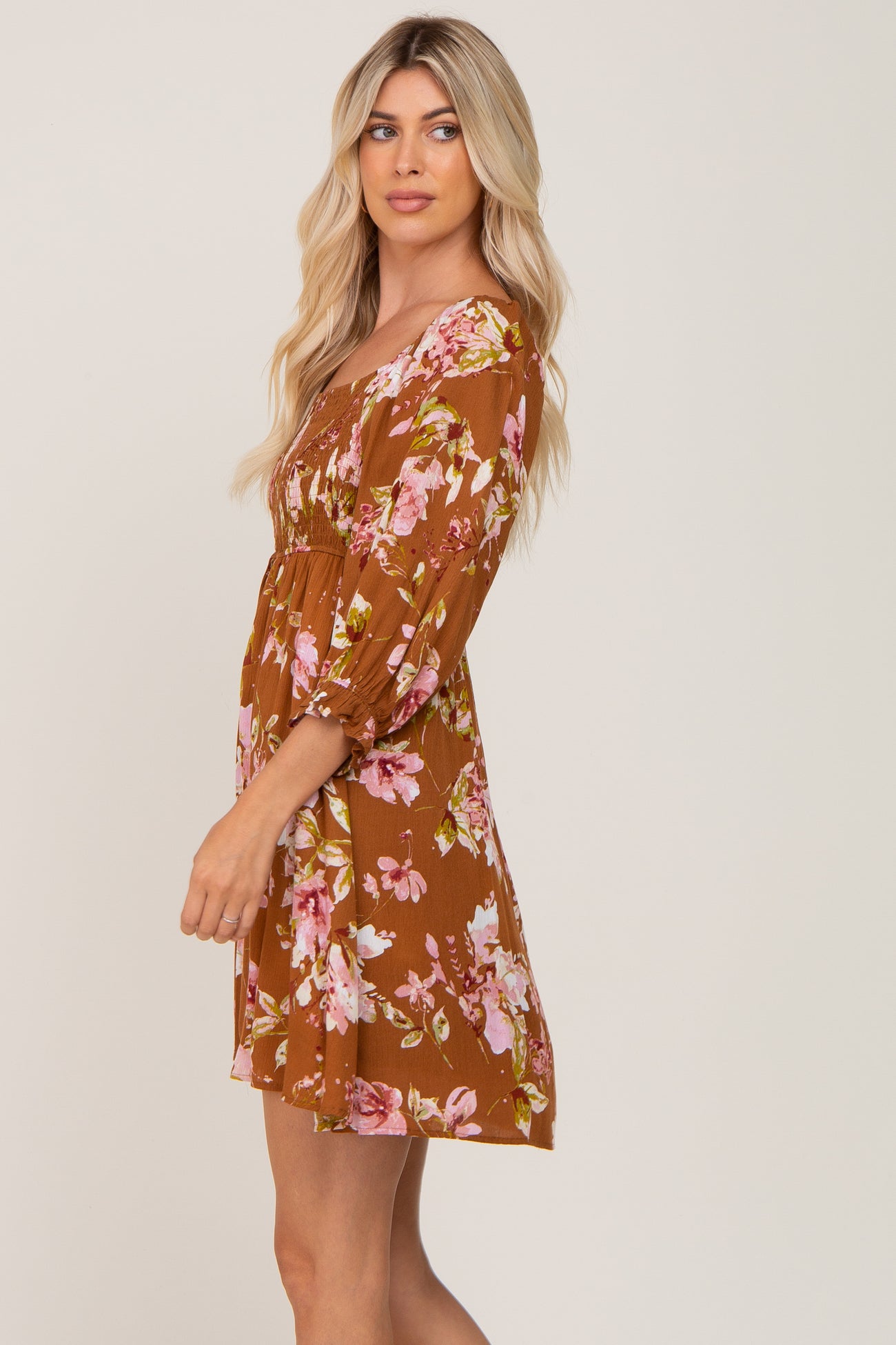 A floral print dress featuring 3/4 ruffle sleeves, a smocked top and a square neckline.