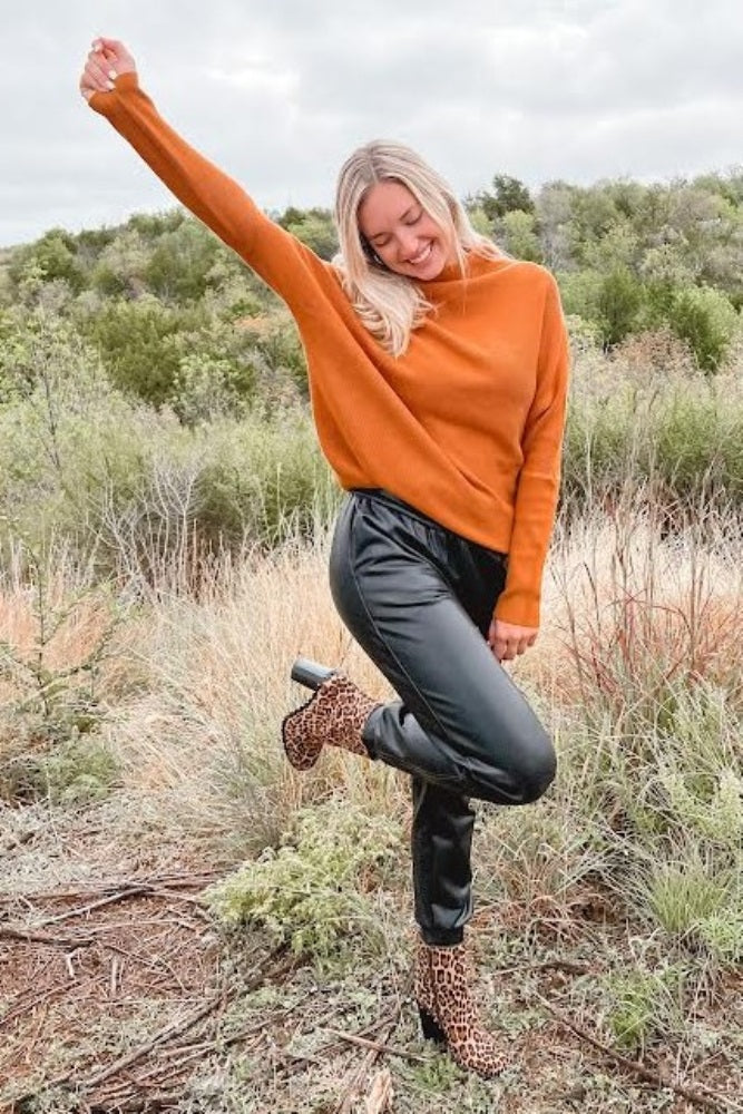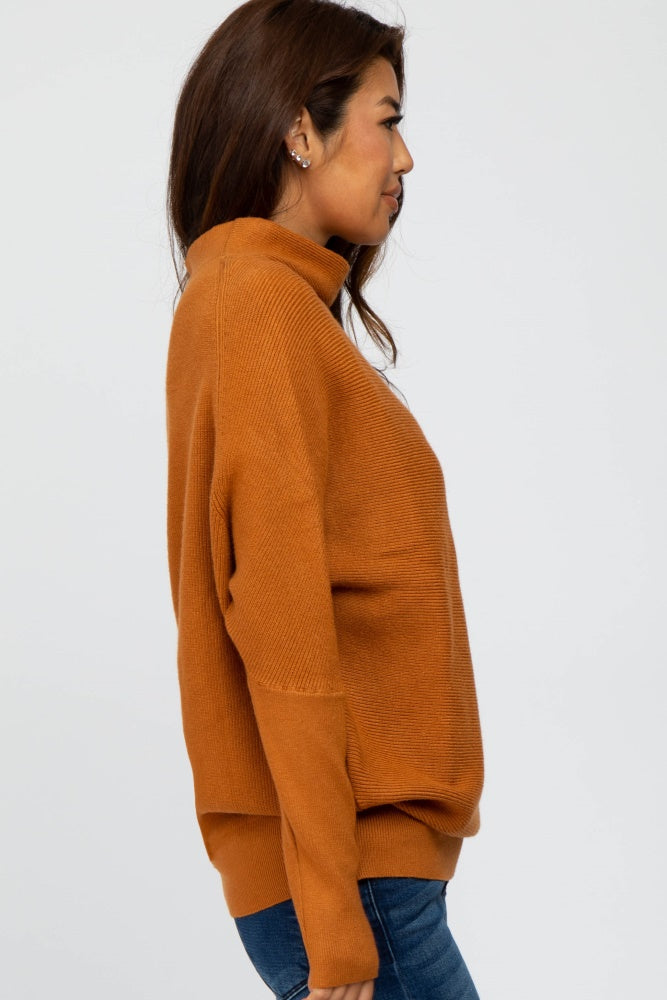 A solid hued sweater featuring a funnel neckline, long dolman sleeves and a fitted bottom hem.