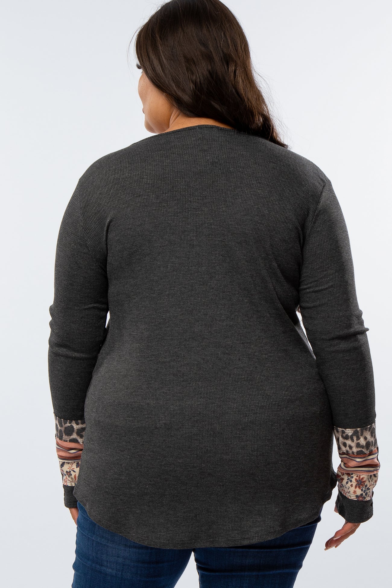 A long sleeve plus top featuring colorblock sleeve and button detail.