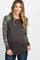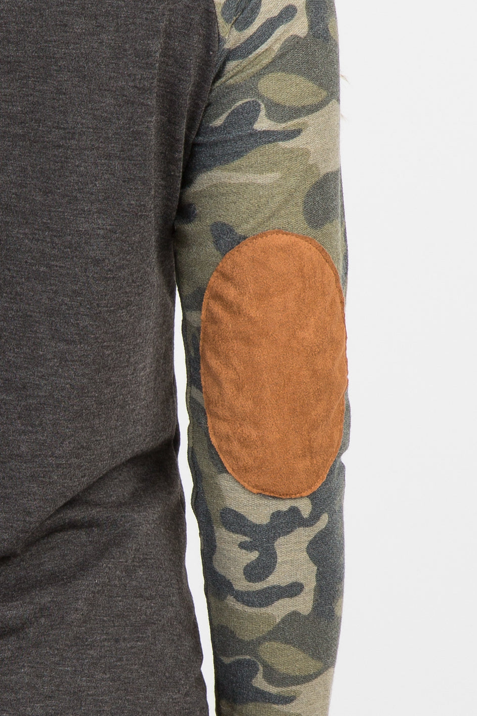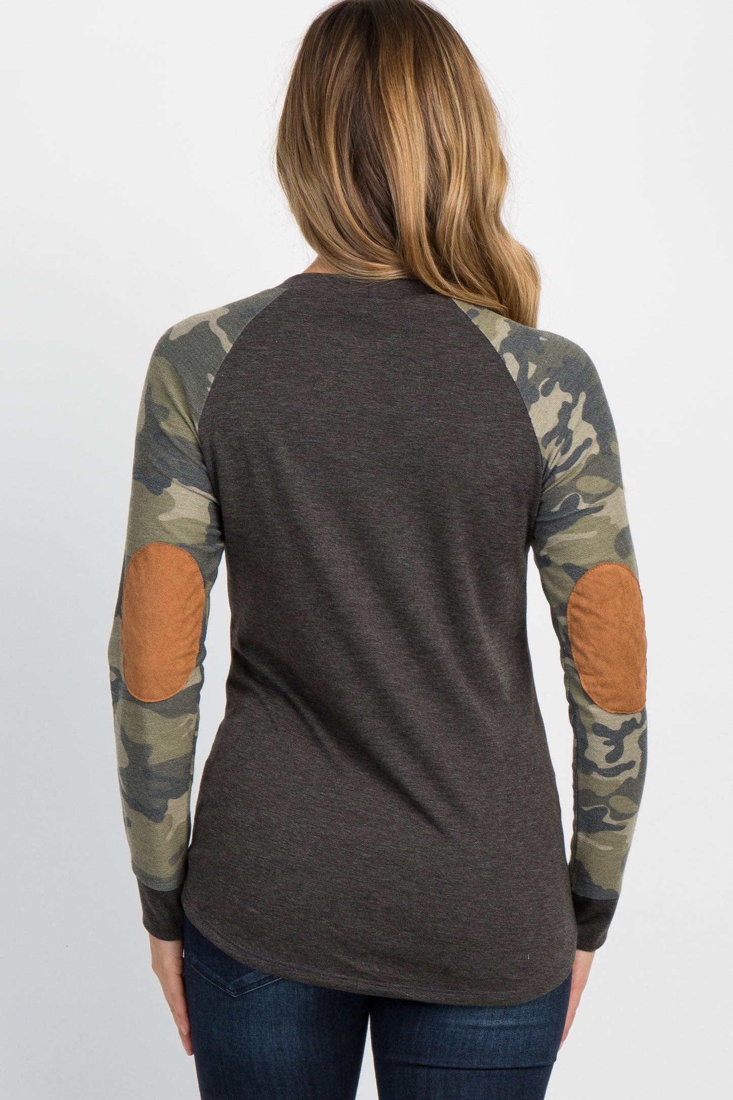 A camo accent colorblock maternity top featuring elbow patch details, rounded neckline, and long sleeves.