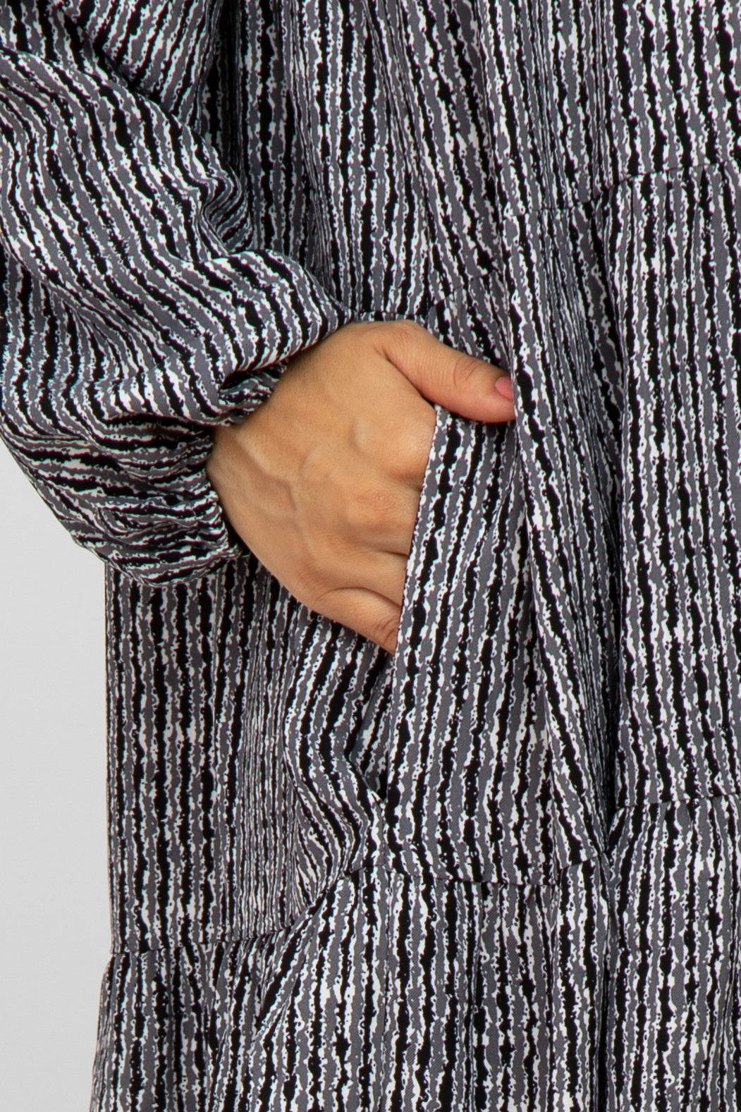 Details A printed dress featuring a v-neckline, a tiered body, side pockets, and long cinched sleeves. Content + Care
