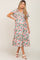 A floral print maternity midi dress featuring a smocked elastic top, a v-neckline, short flutter sleeves, a ruffle hem and double lined.