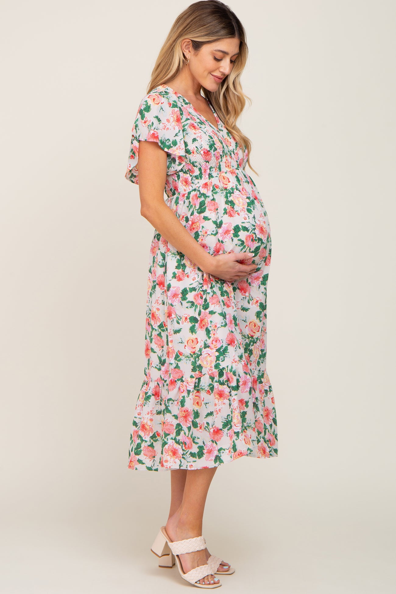Cream Floral Smocked Flutter Sleeve Maternity Midi Dress