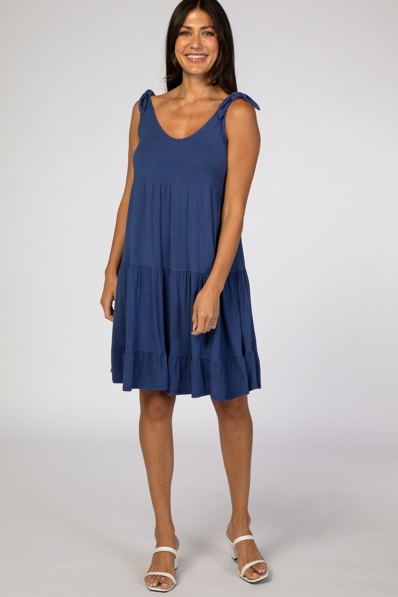 Details A solid hued dress featuring knotted straps, a tiered silhouette and a slight v-neck. Content + Care