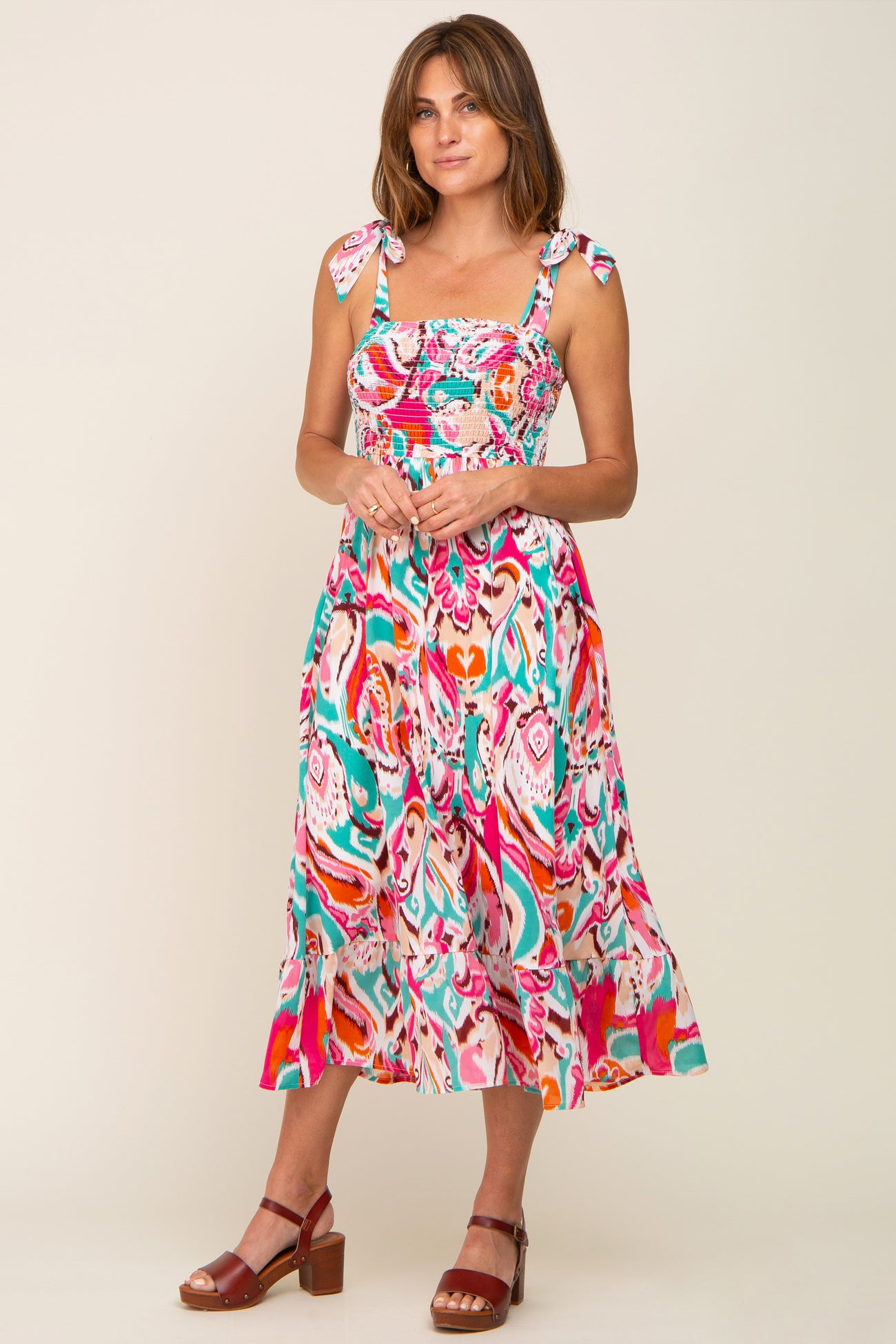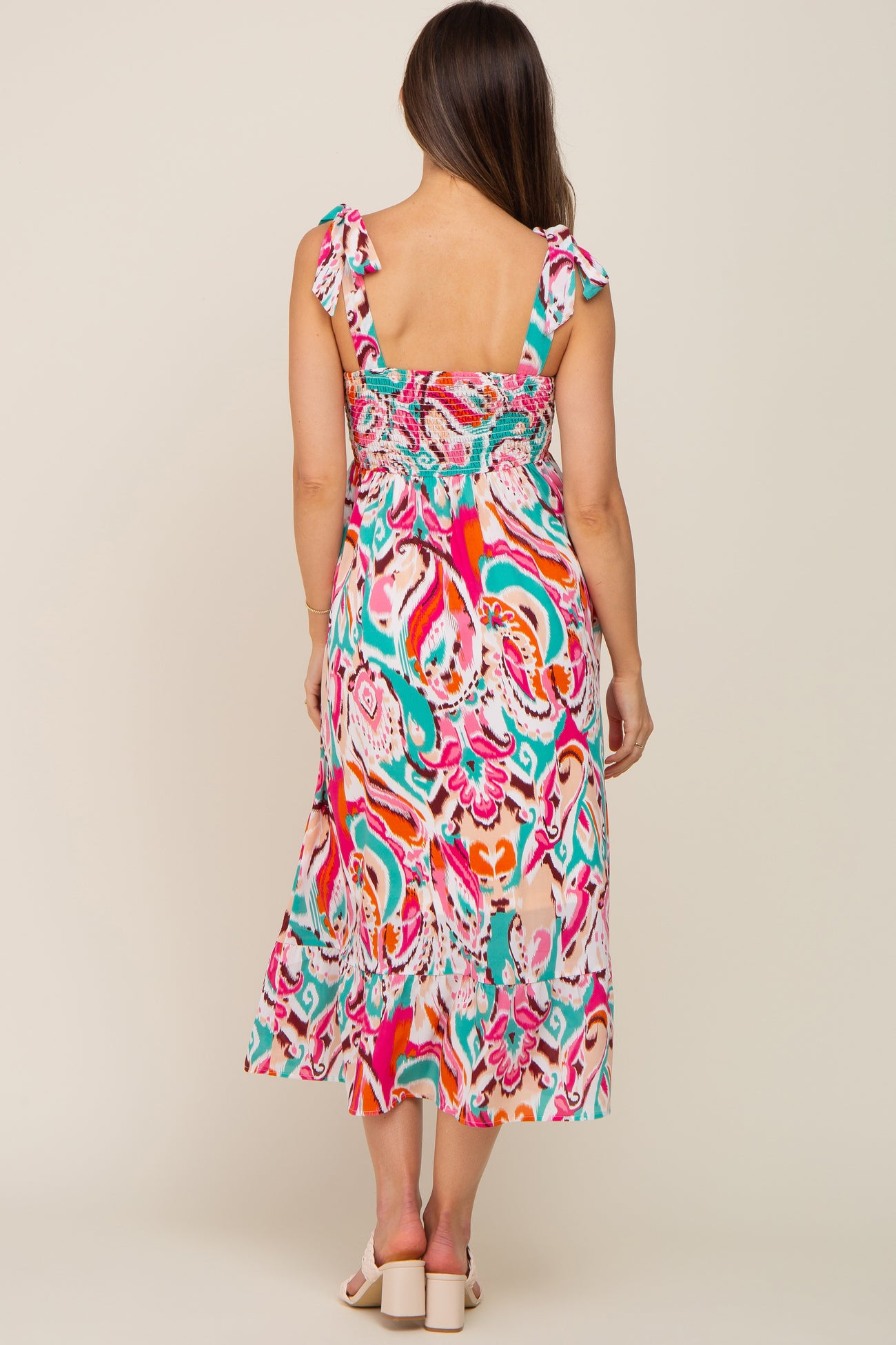 A printed maternity midi with adjustable shoulder ties, a smocked bodice, and a lined skirt.