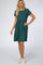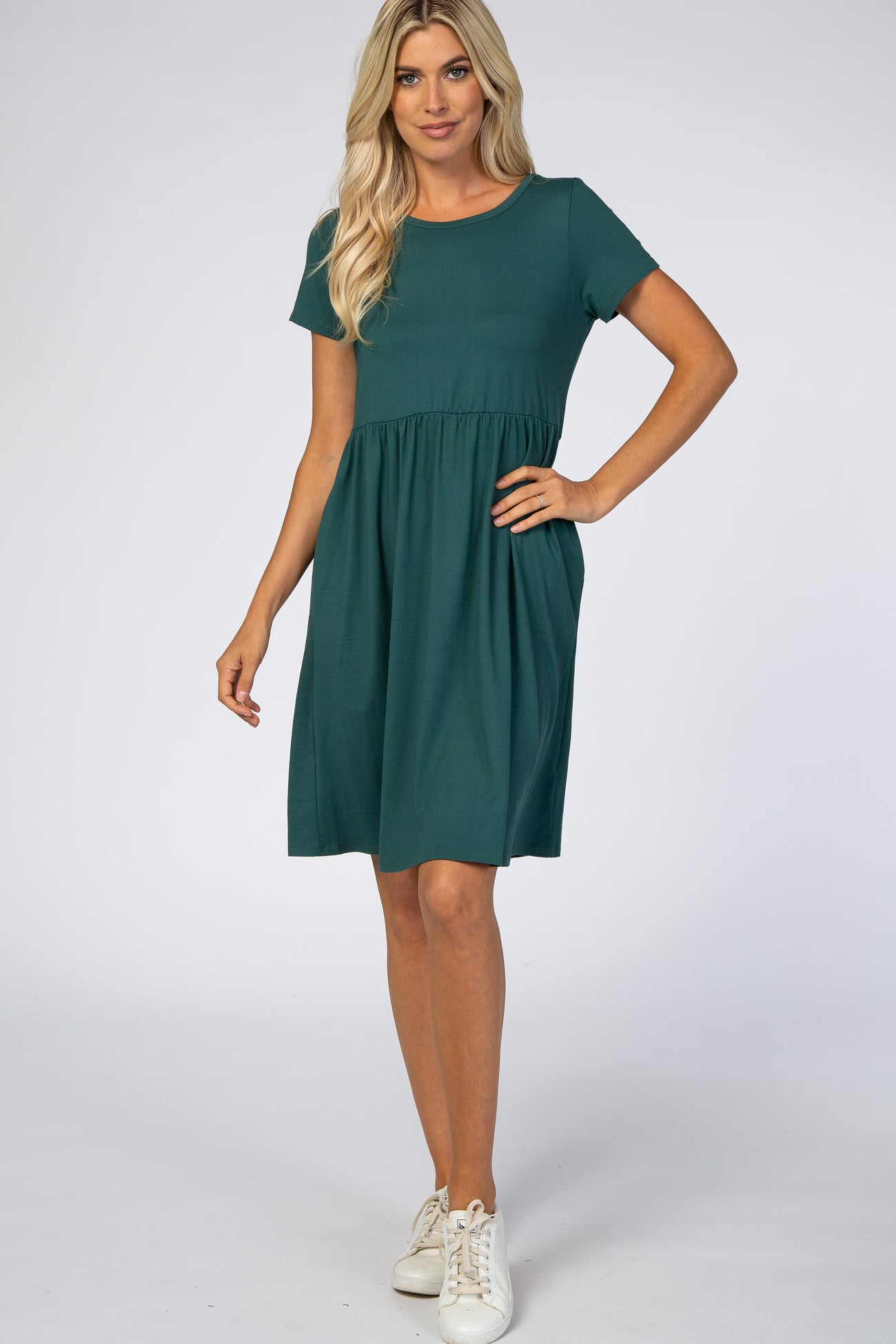 A soft knit dress featuring short sleeves, a rounded neckline, a pleated elastic waist and side pockets.