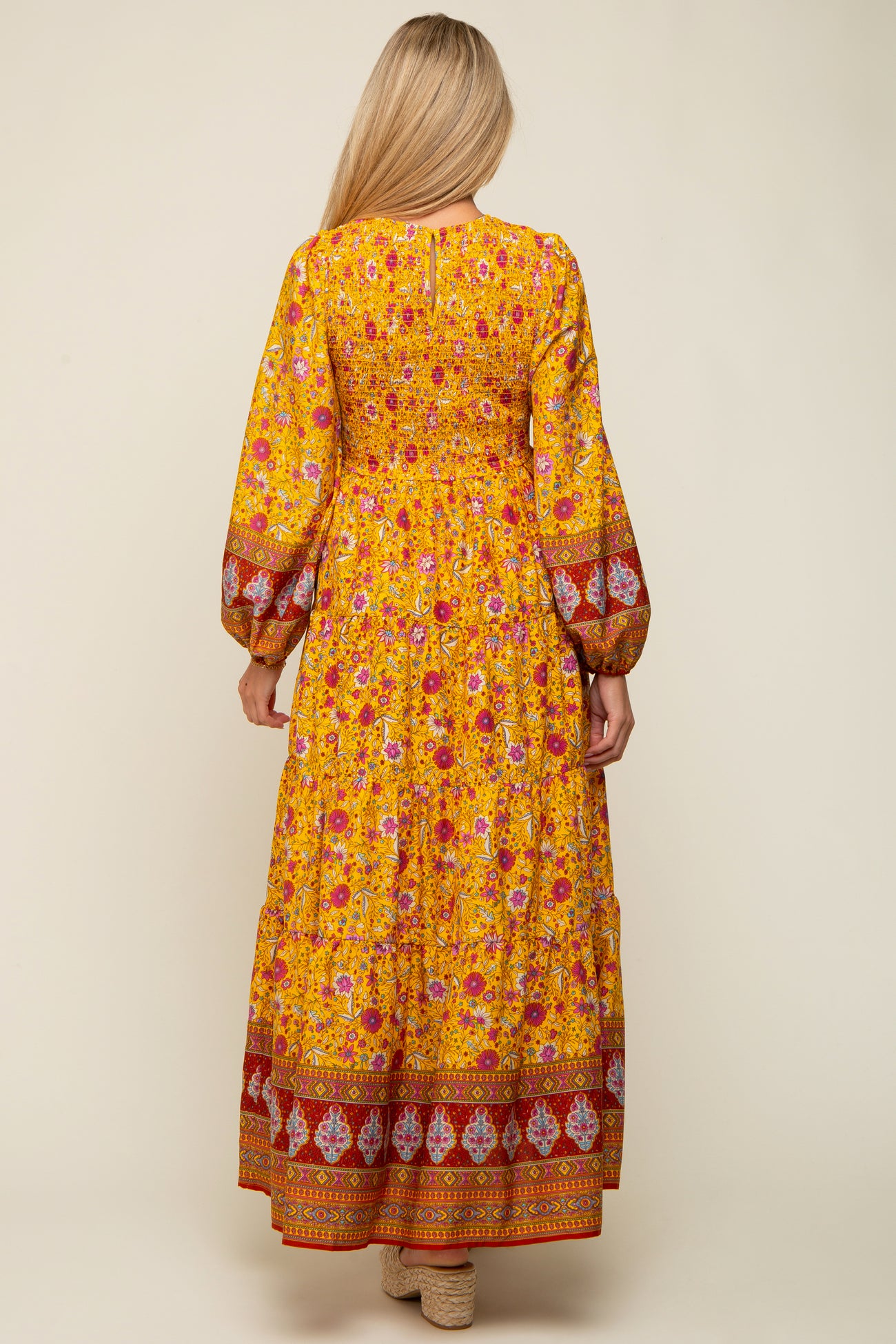Gold Floral Smocked Tiered Maternity Maxi Dress