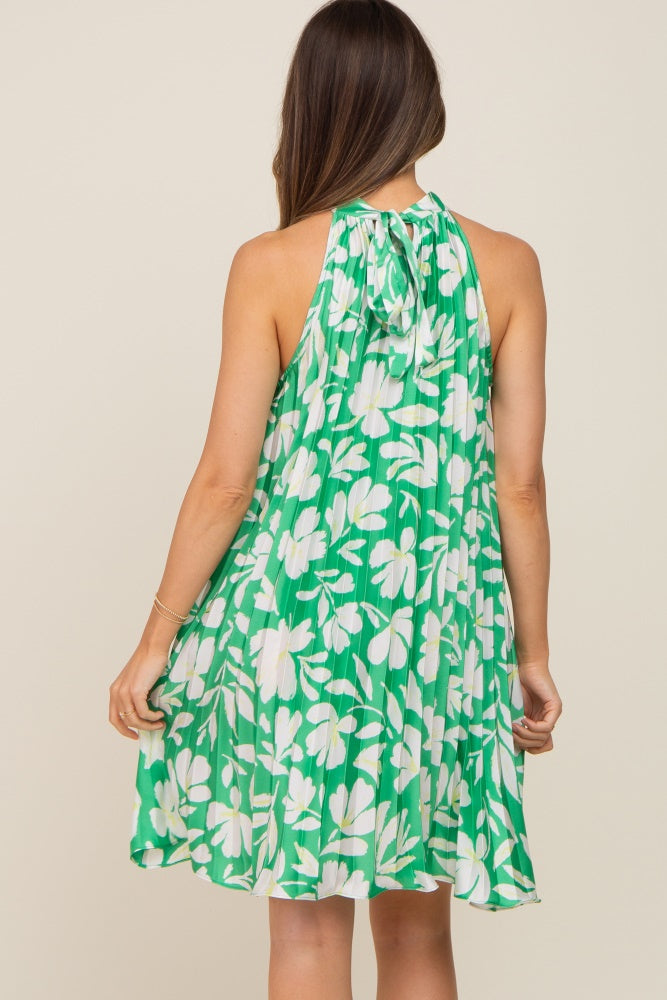 A floral pleated maternity dress that features a mock neckline and a back neck tie.