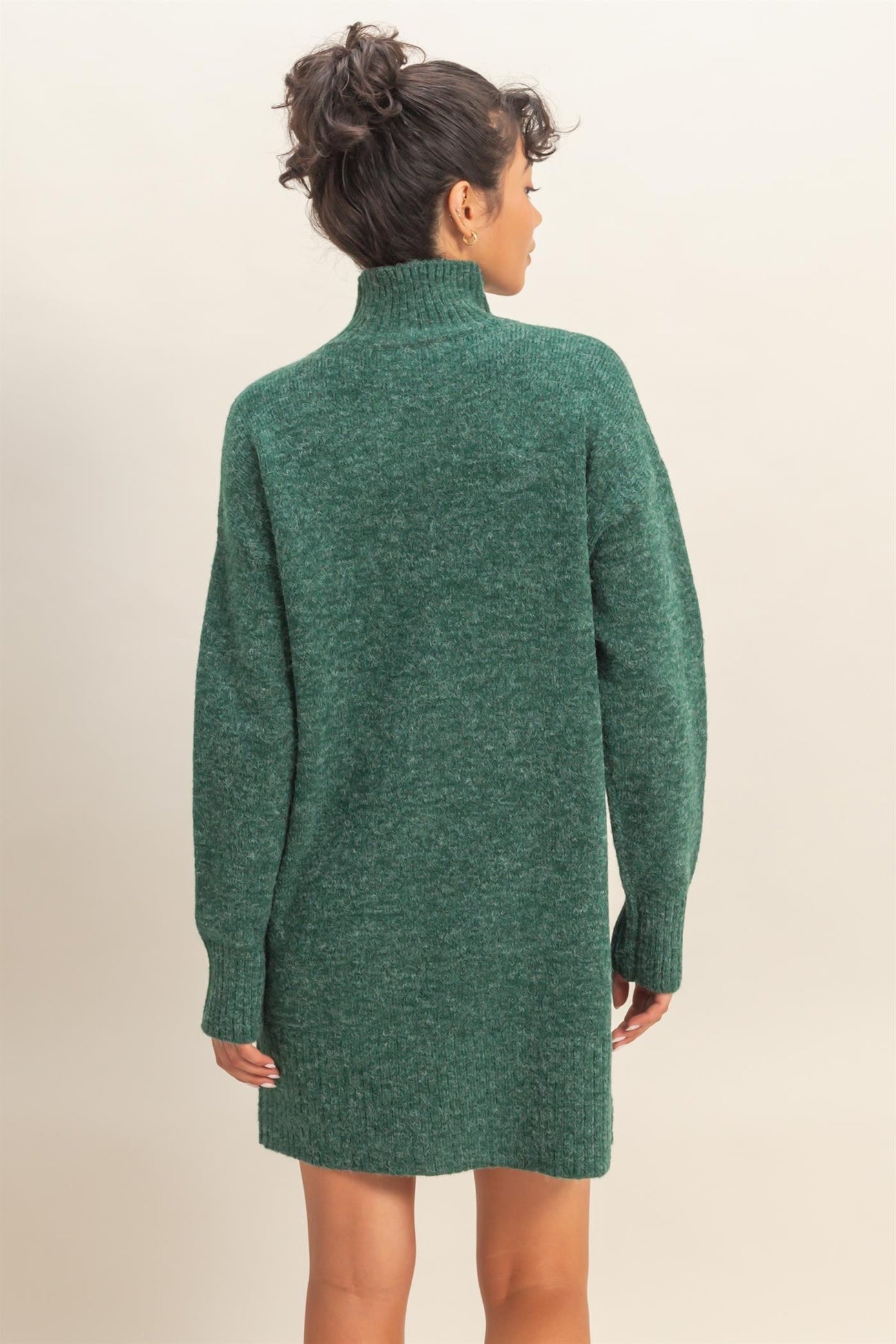 Stay cozy and chic with our Green High Neck Sweater Mini Dress. Crafted from a soft, warm knit fabric, this dress features a flattering high neckline and long sleeves for added comfort during cooler days. The relaxed fit and ribbed hem add a stylish touch, making it perfect for casual outings or dressed-up occasions. Pair it with ankle boots or knee-highs for a versatile look you'll love. Available in a rich, forest green shade that complements any wardrobe. Embrace effortless style without compromising on comfort with this must-have sweater dress!