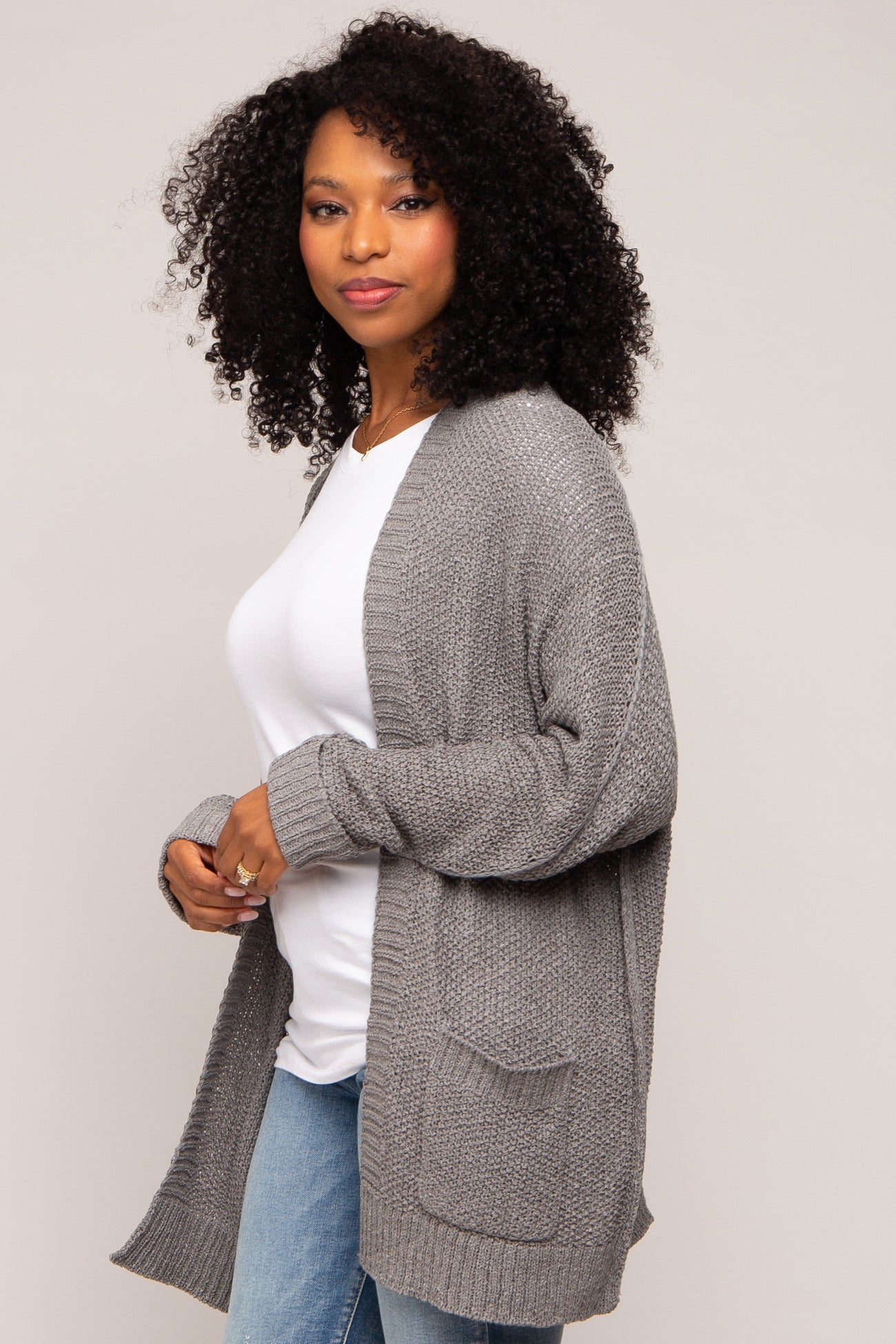 A cardigan featuring front pockets, an open front and dolman cuffed long sleeves.