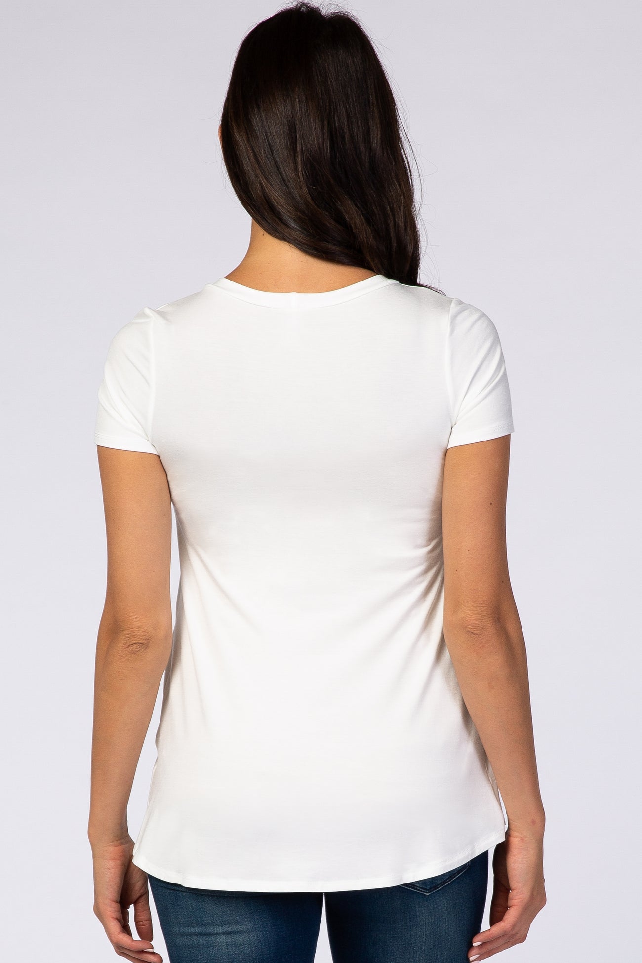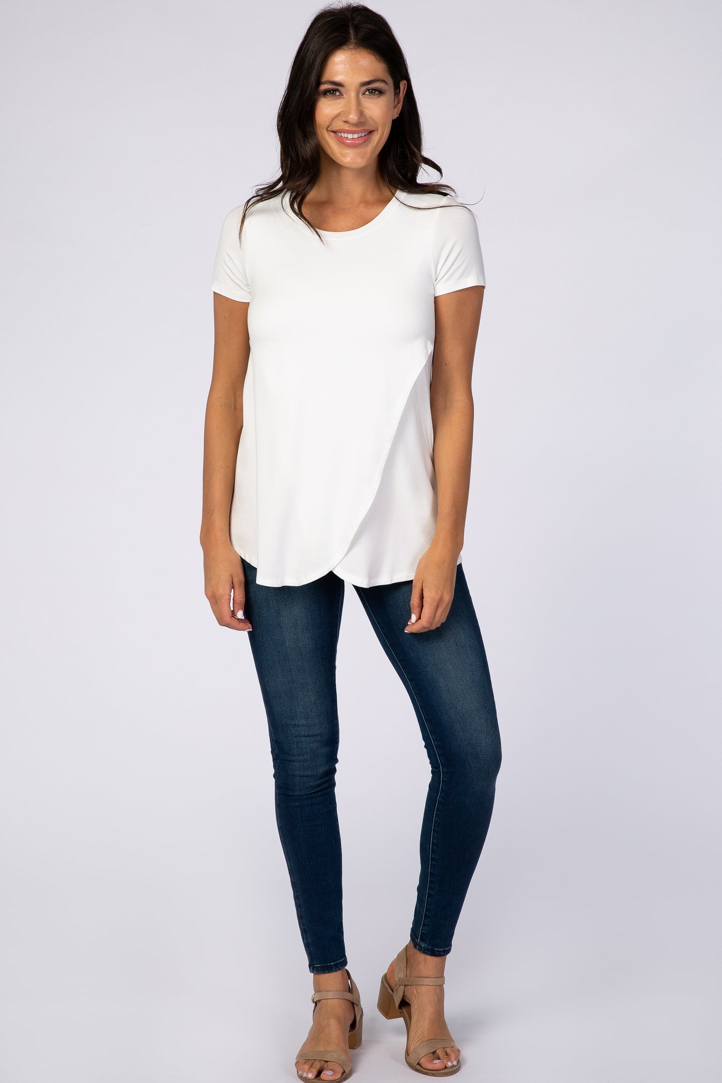 A solid hued short sleeve nursing top featuring a wrap front accent and a rounded neckline.