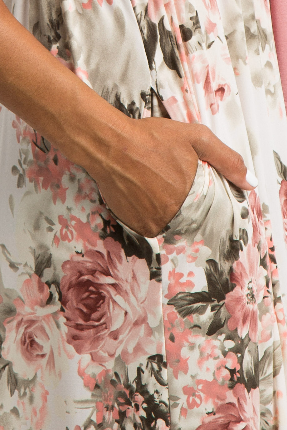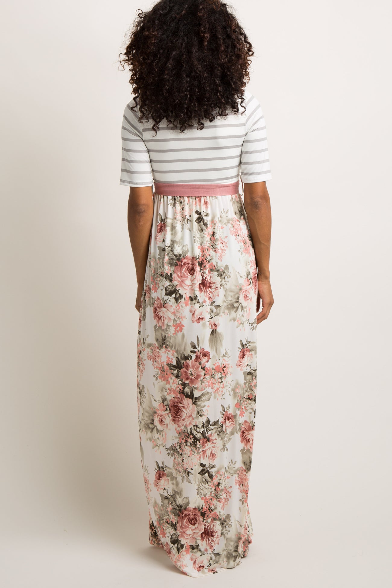 Details A colorblock maxi dress with a striped top and a floral print skirt. Additional details include 3/4 sleeves, a rounded neckline, cinched elastic waistline, belt loops with a sash tie, side pockets, and double lined bust. Content + Care