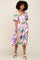 A watercolor print midi dress with a squared neckline, short puff sleeves, a smocked back, and a tiered skirt. Dress is lined.