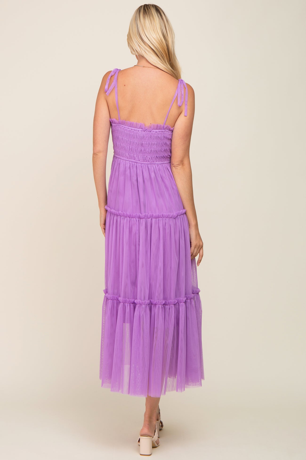 Details A mesh midi dress featuring a smocked bodice, adjustable shoulder ties, and a ruffle tiered skirt. Content + Care