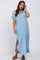A solid short sleeve maternity midi dress with collared neckline, front pocket detail, button down closure in front, hidden side pockets and rounded split hem.