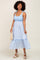A printed skirt, solid top dress. Lightweight, double lined skirt. Ribbed bust with tie straps and a rounded neckline.