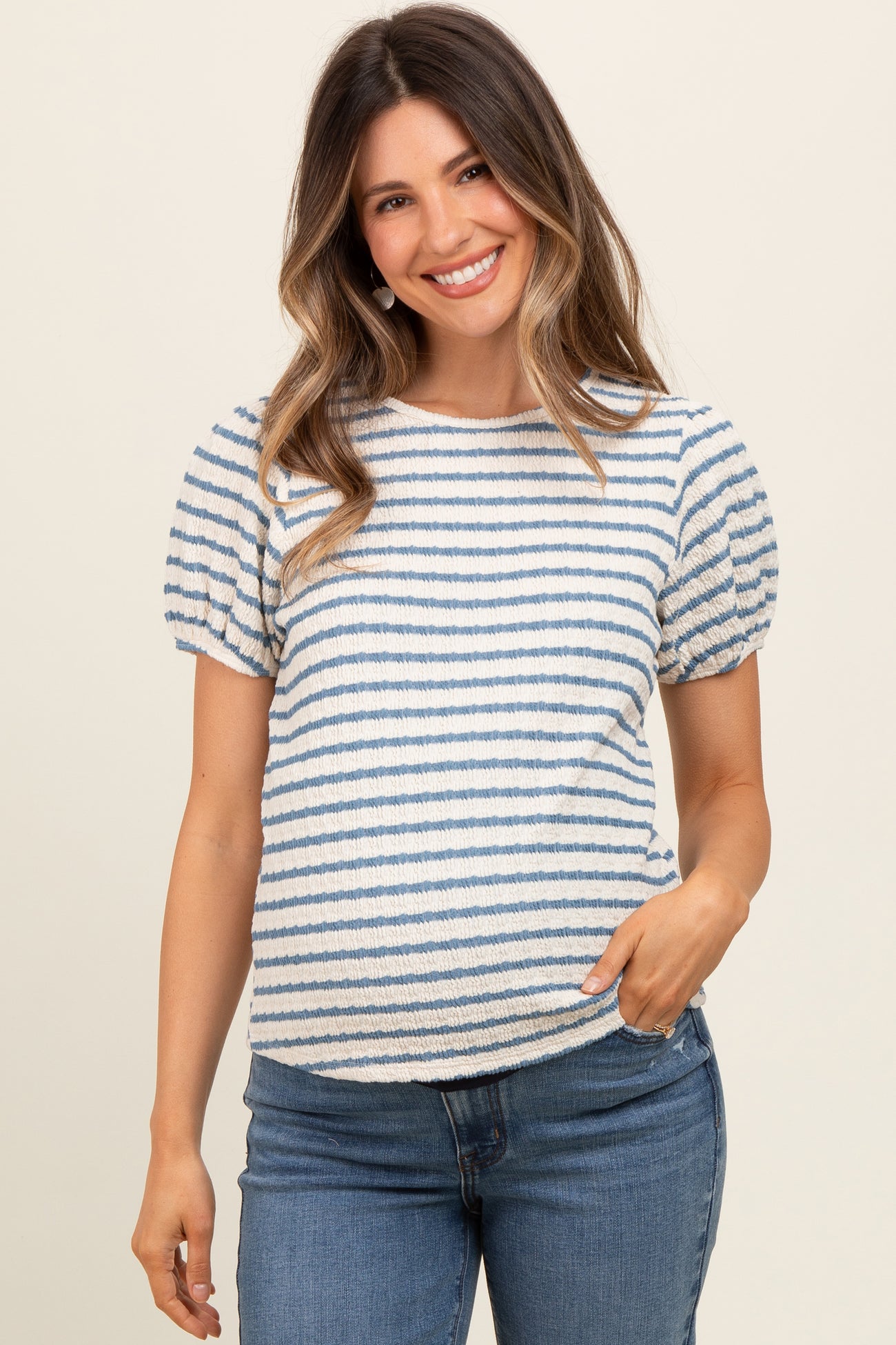Light Blue Striped Textured Puff Sleeve Maternity Top