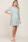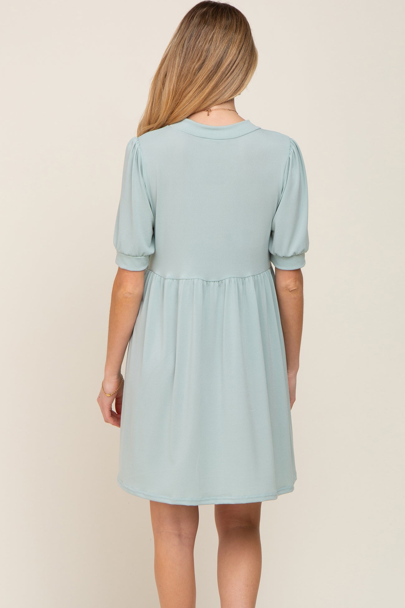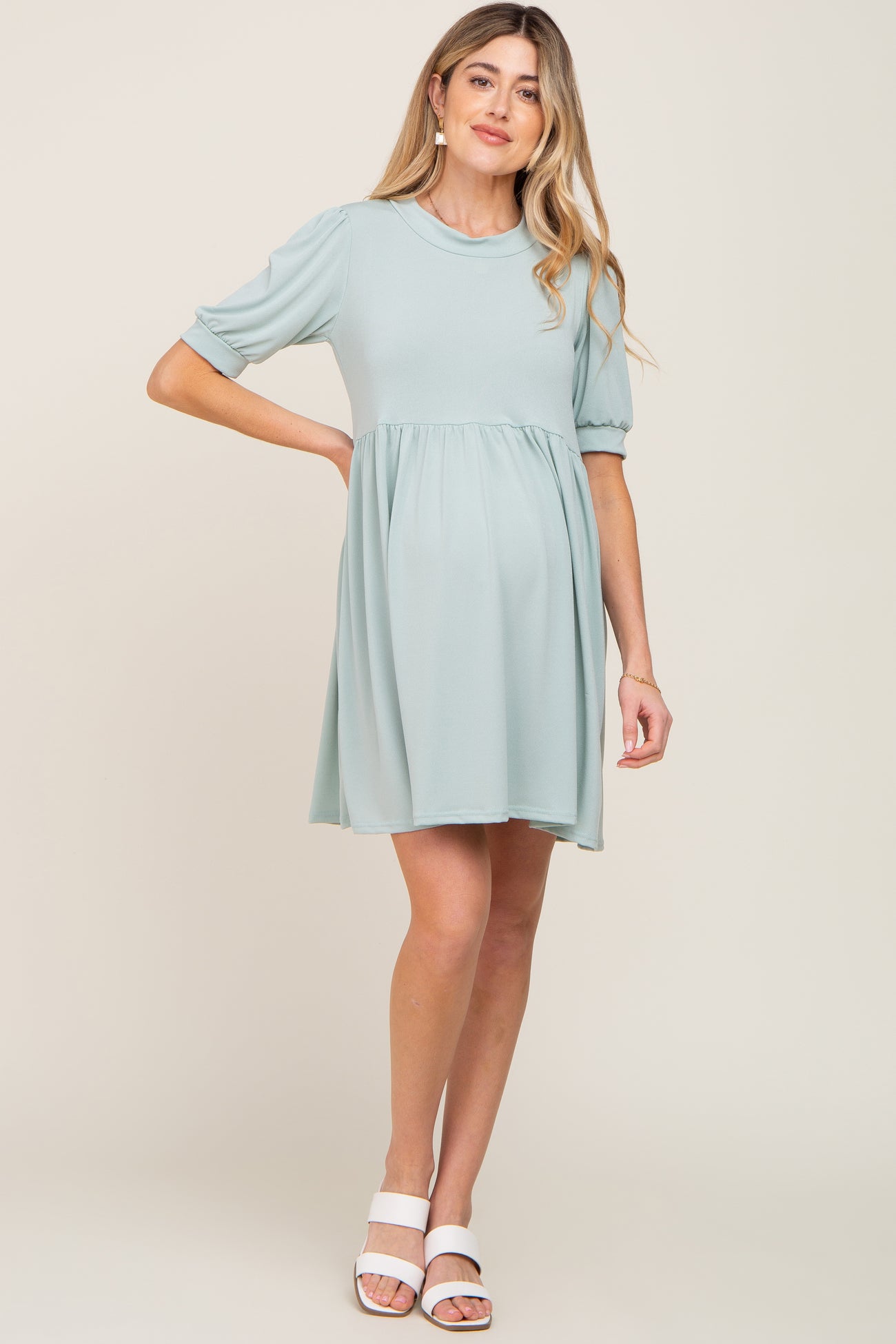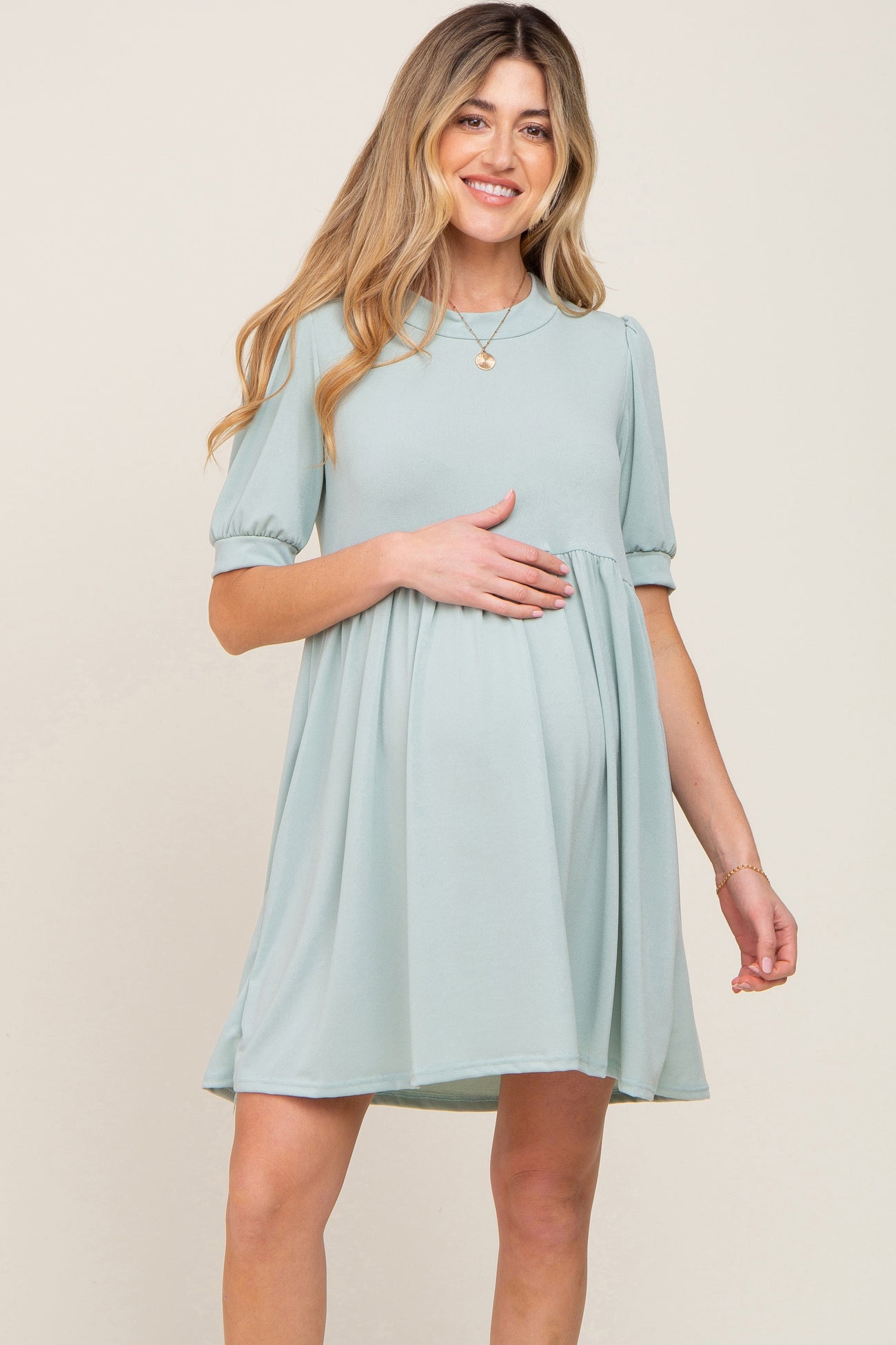 A solid hue maternity dress featuring a rounded neckline, short puff sleeves, and an elastic waist.