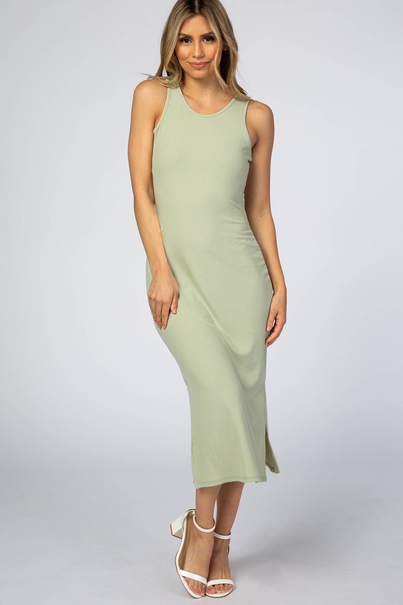 Light Green Ribbed Sleeveless Fitted Midi Dress