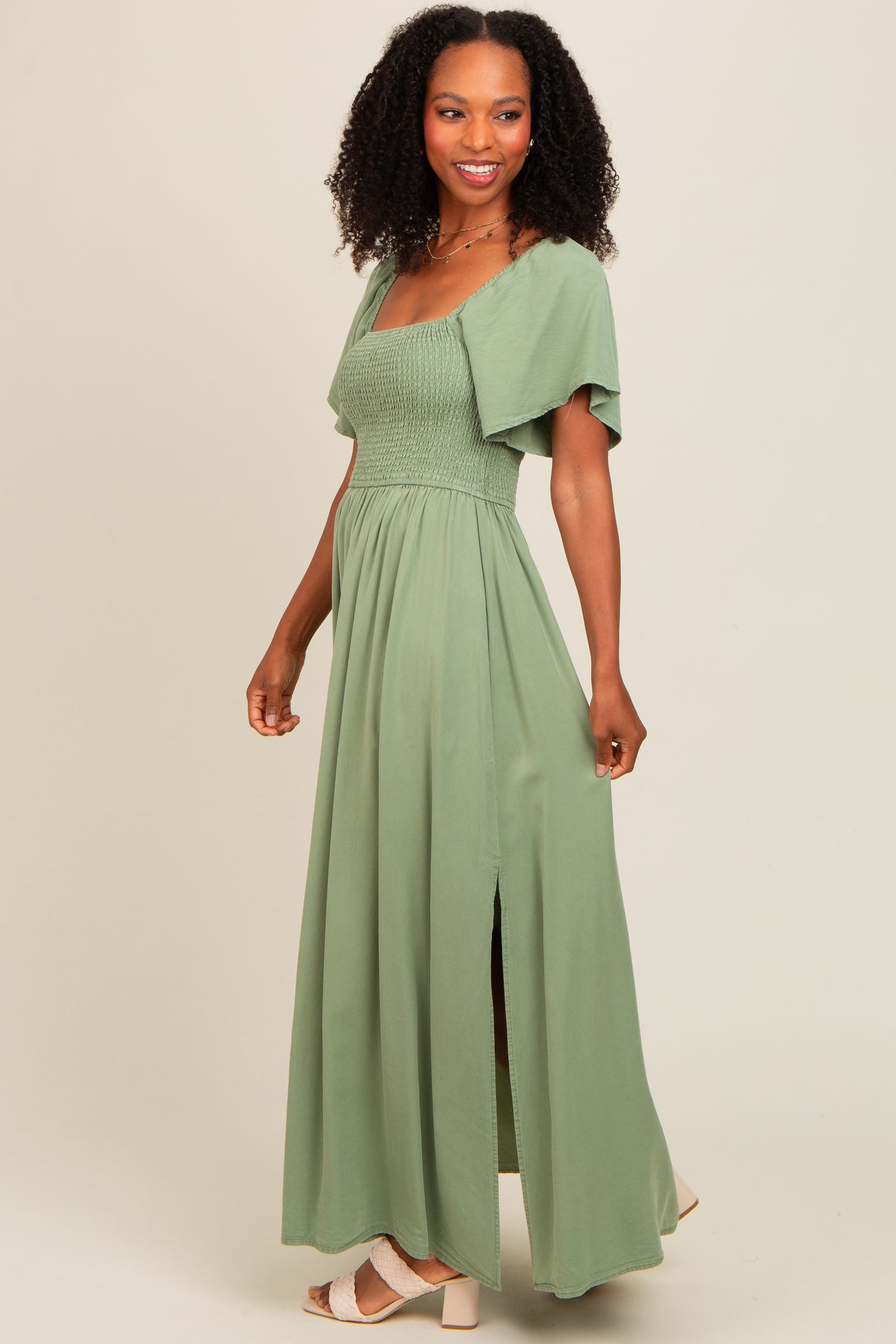 Embrace effortless elegance with our Light Olive Chambray Smocked Maxi Dress. Crafted from soft, breathable chambray, this dress features a flattering smocked bodice that hugs your silhouette while providing comfort and stretch. The square neckline and flutter sleeves add a touch of romantic charm, perfectly balanced by a flowing maxi skirt with a chic side slit for easy movement and subtle allure. Whether you're dressing up for a summer event or enjoying a casual day out, this versatile dress in a soothing light olive shade is a timeless addition to your wardrobe. Pair it with sandals or heels for an effortlessly stylish look.