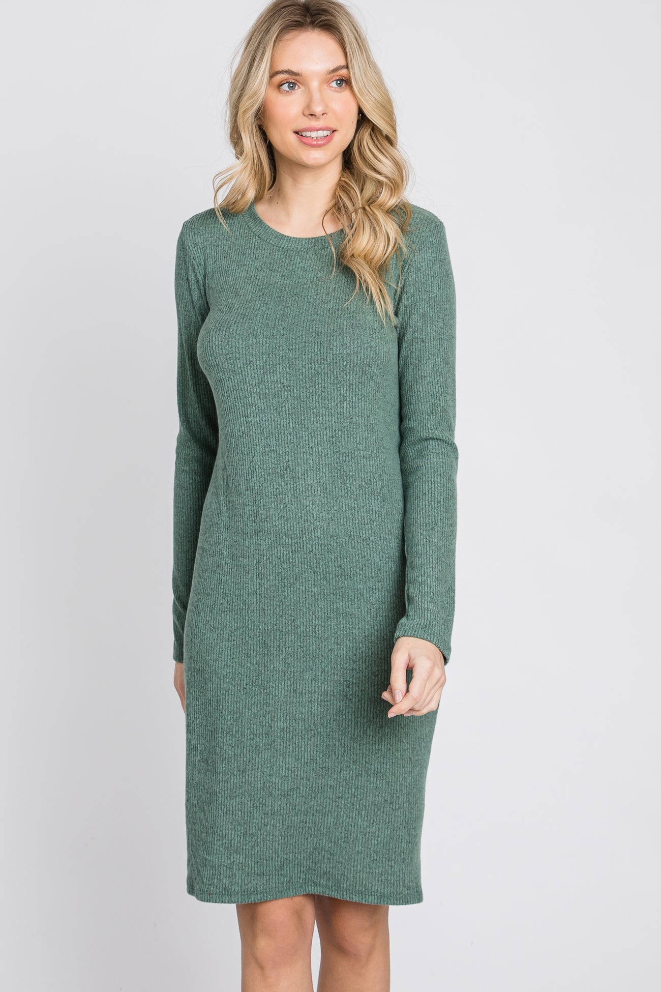 A heather knit dress featuring a ribbed texture, long sleeves and a rounded neckline.
