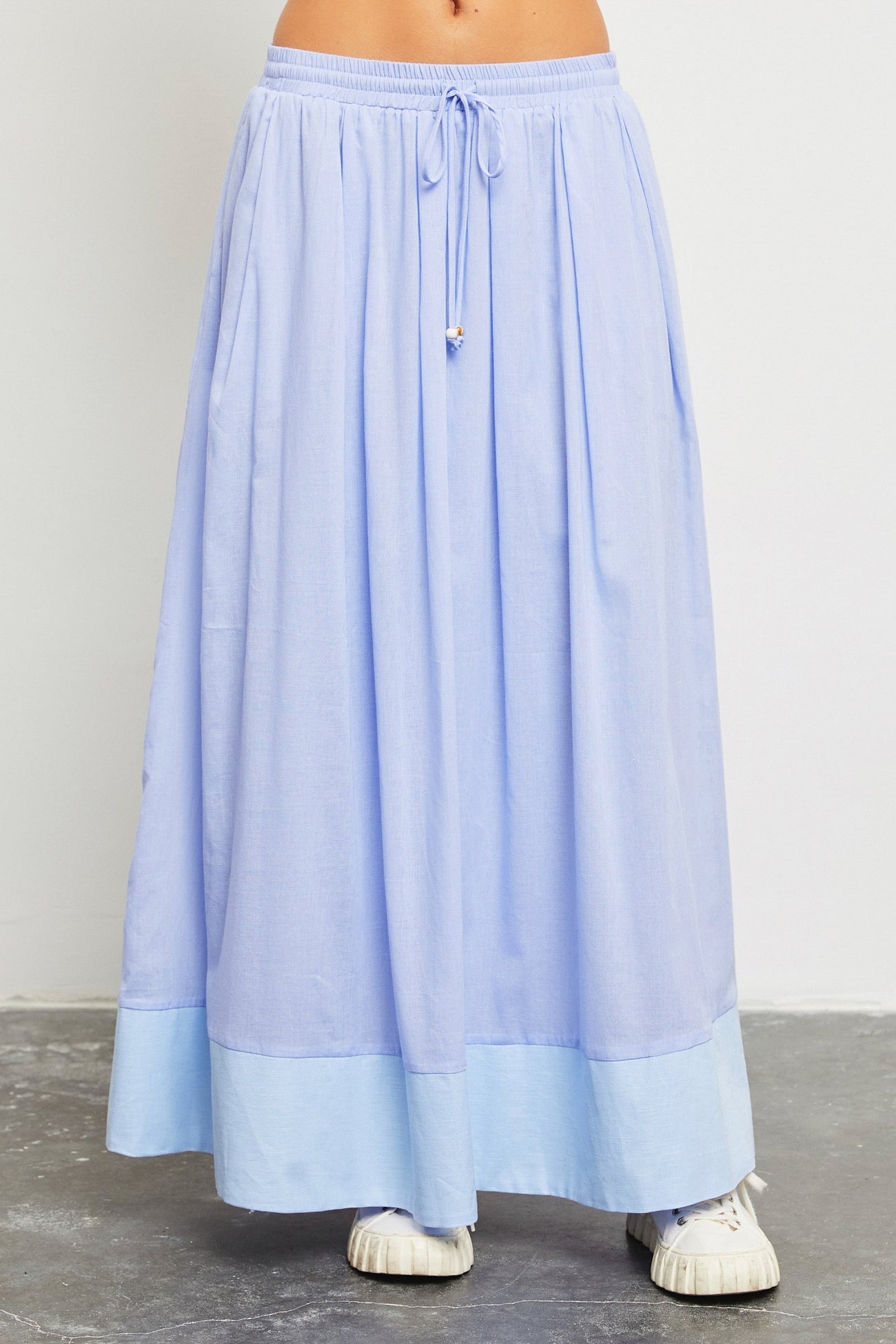 A colorblock maxi skirt with an elastic waist, a waist tie, and full lining.