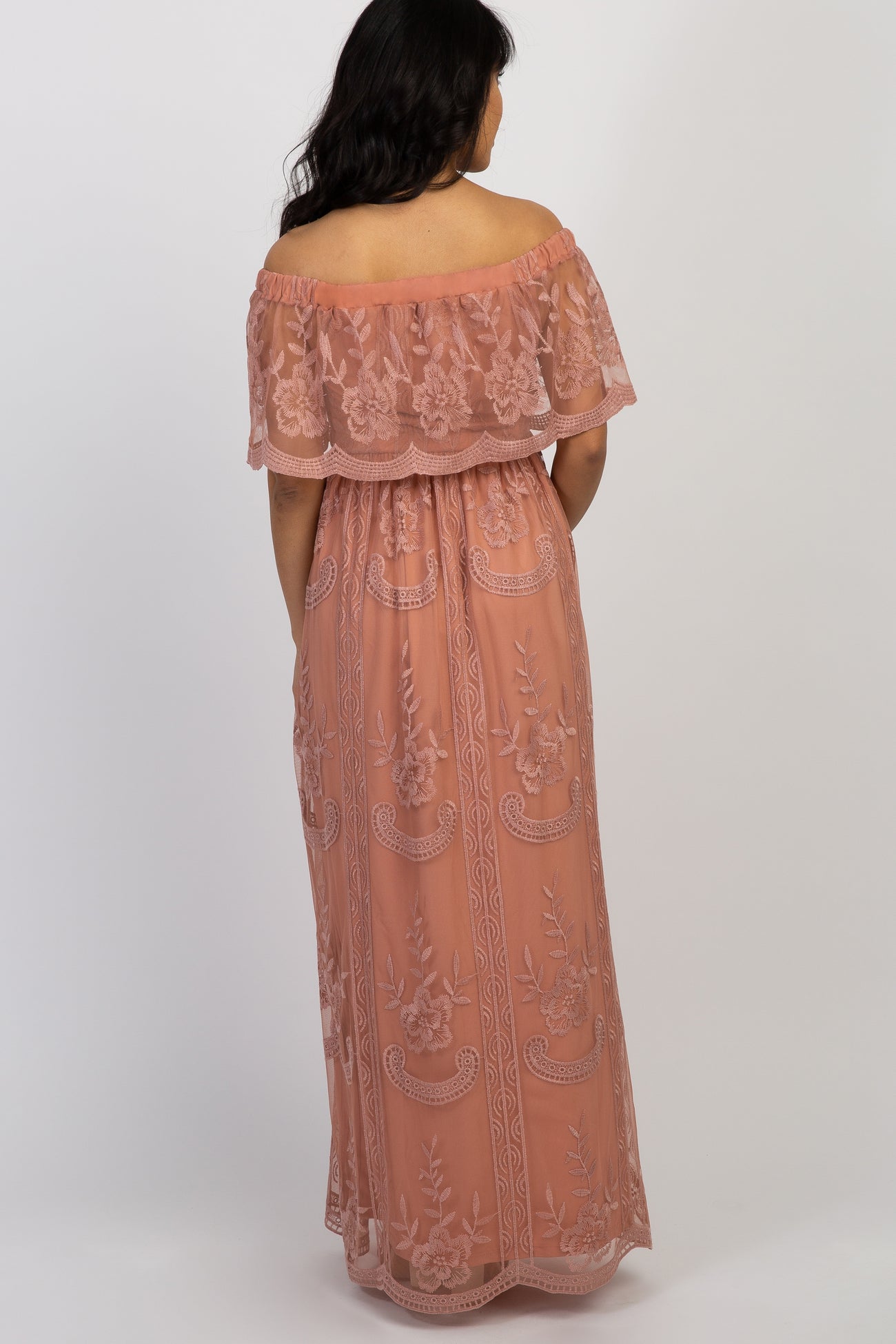 Light Pink Lace Mesh Overlay Off Shoulder Maternity Maxi Dress