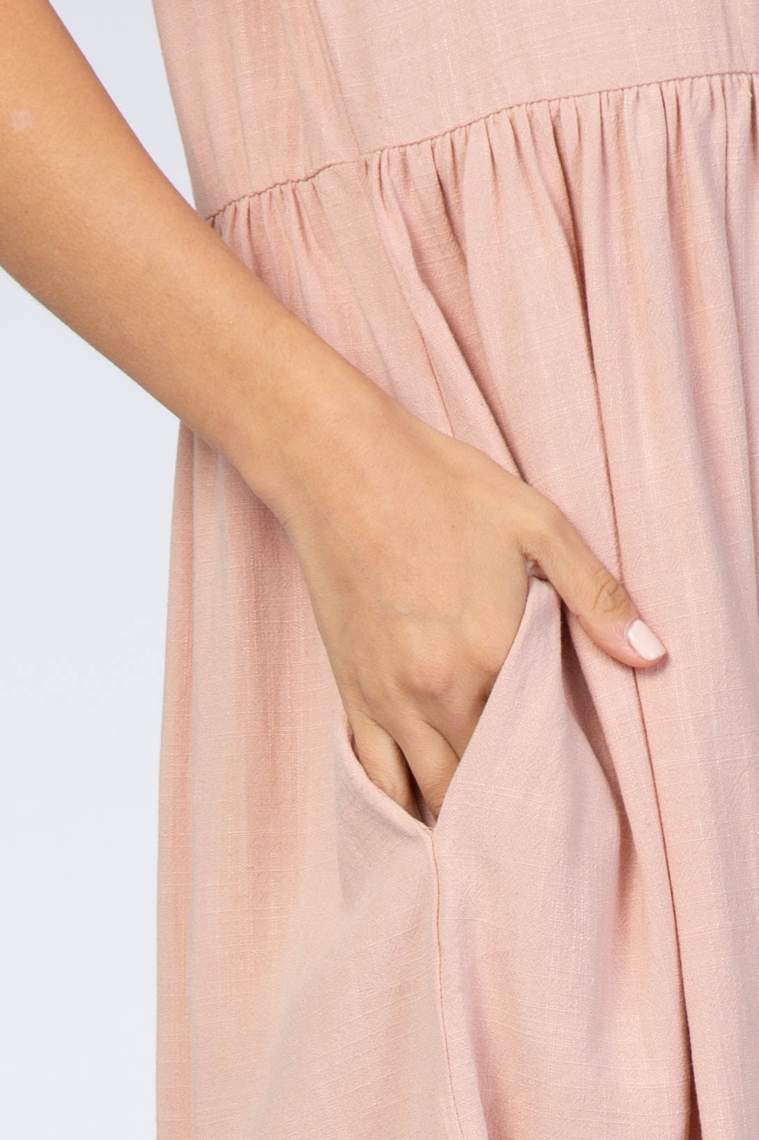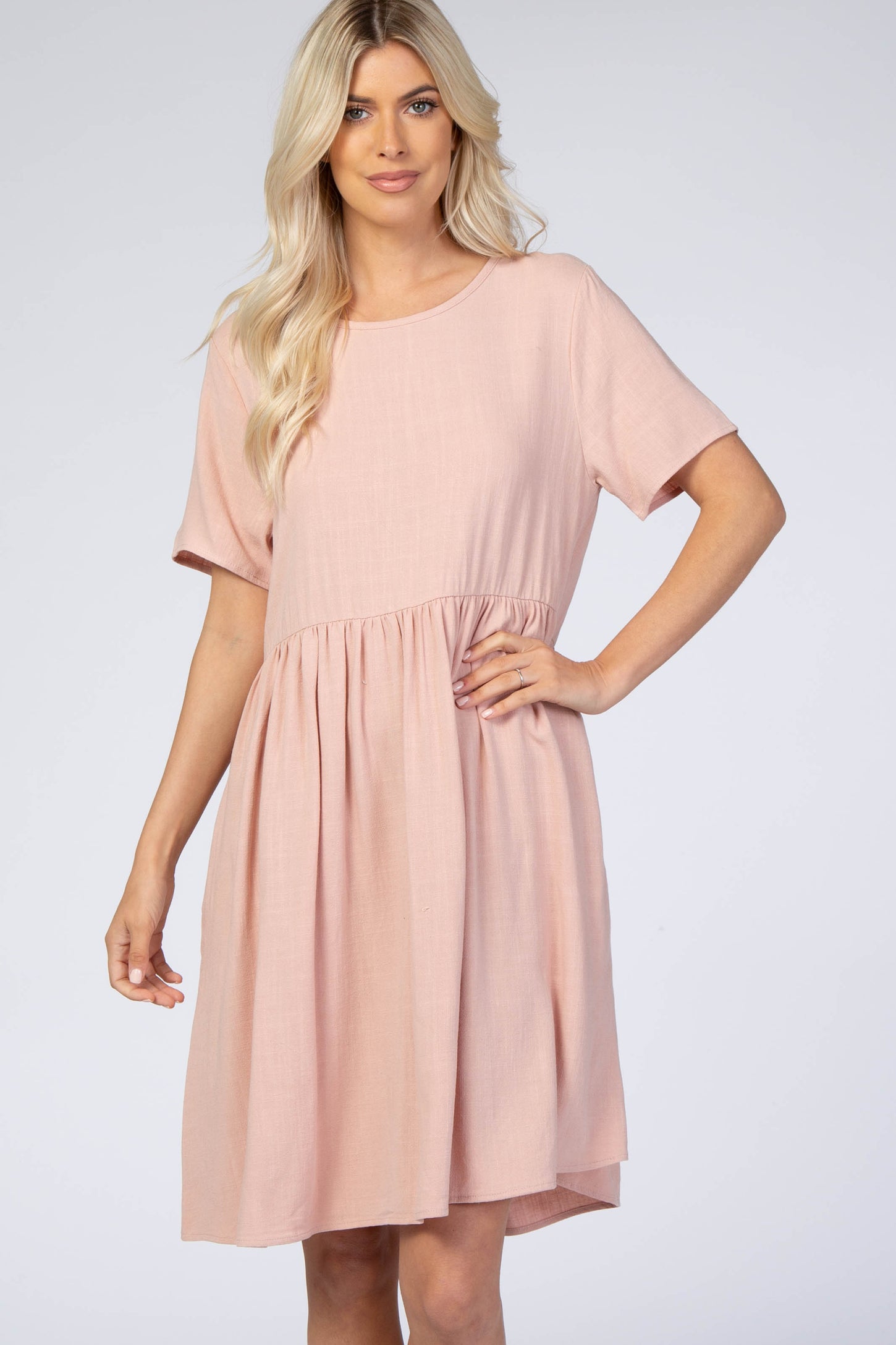 A linen dress featuring a rounded neckline, short sleeves, a babydoll hem and side pockets.