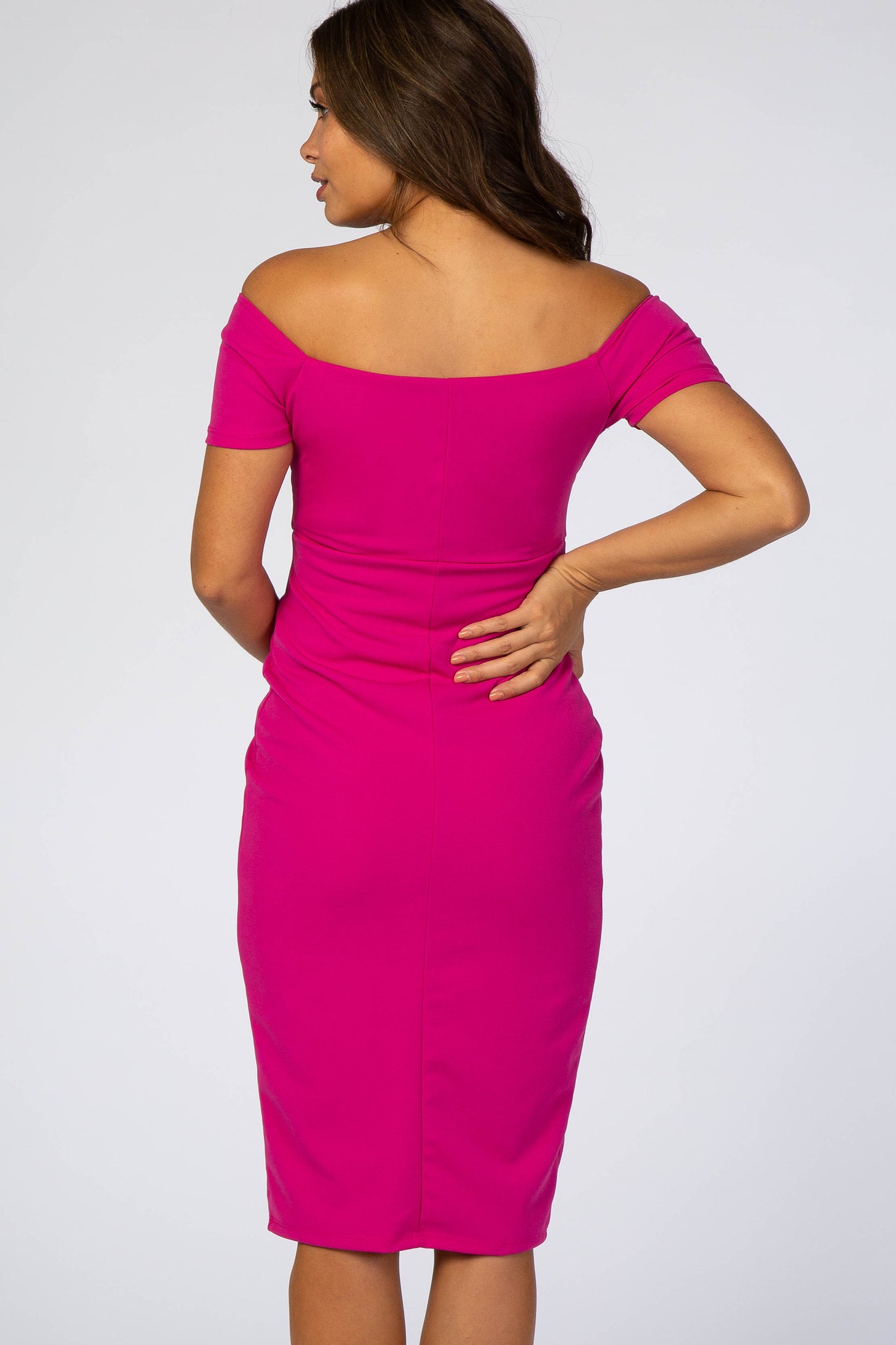 Magenta Solid Off Shoulder Maternity Fitted Dress