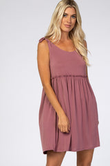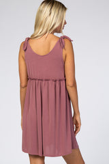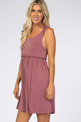 A solid sleeveless dress with a knot tie detail straps and a ruffle trim detail under the bust.