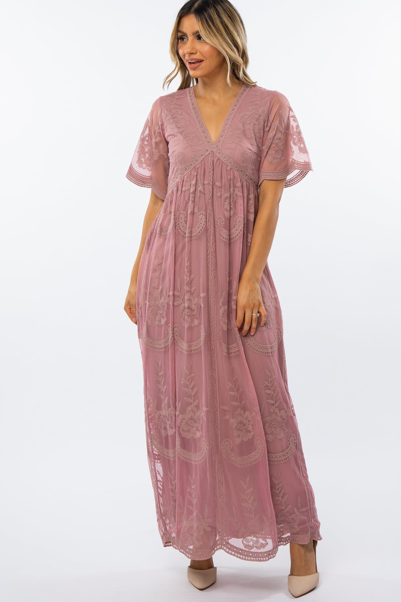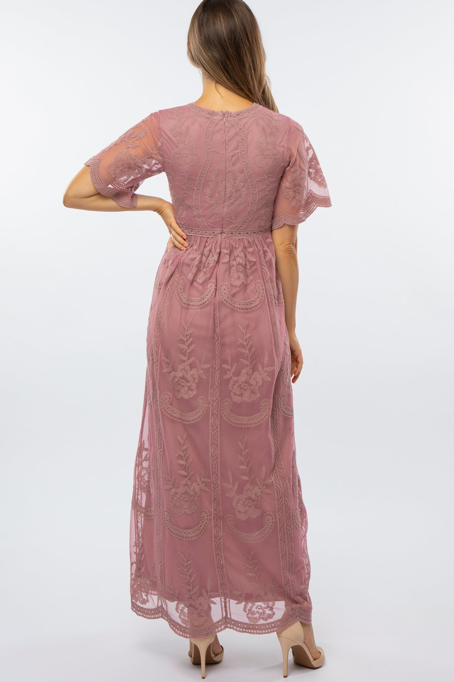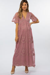 Mauve Lace Mesh Overlay Maternity Maxi Dress