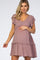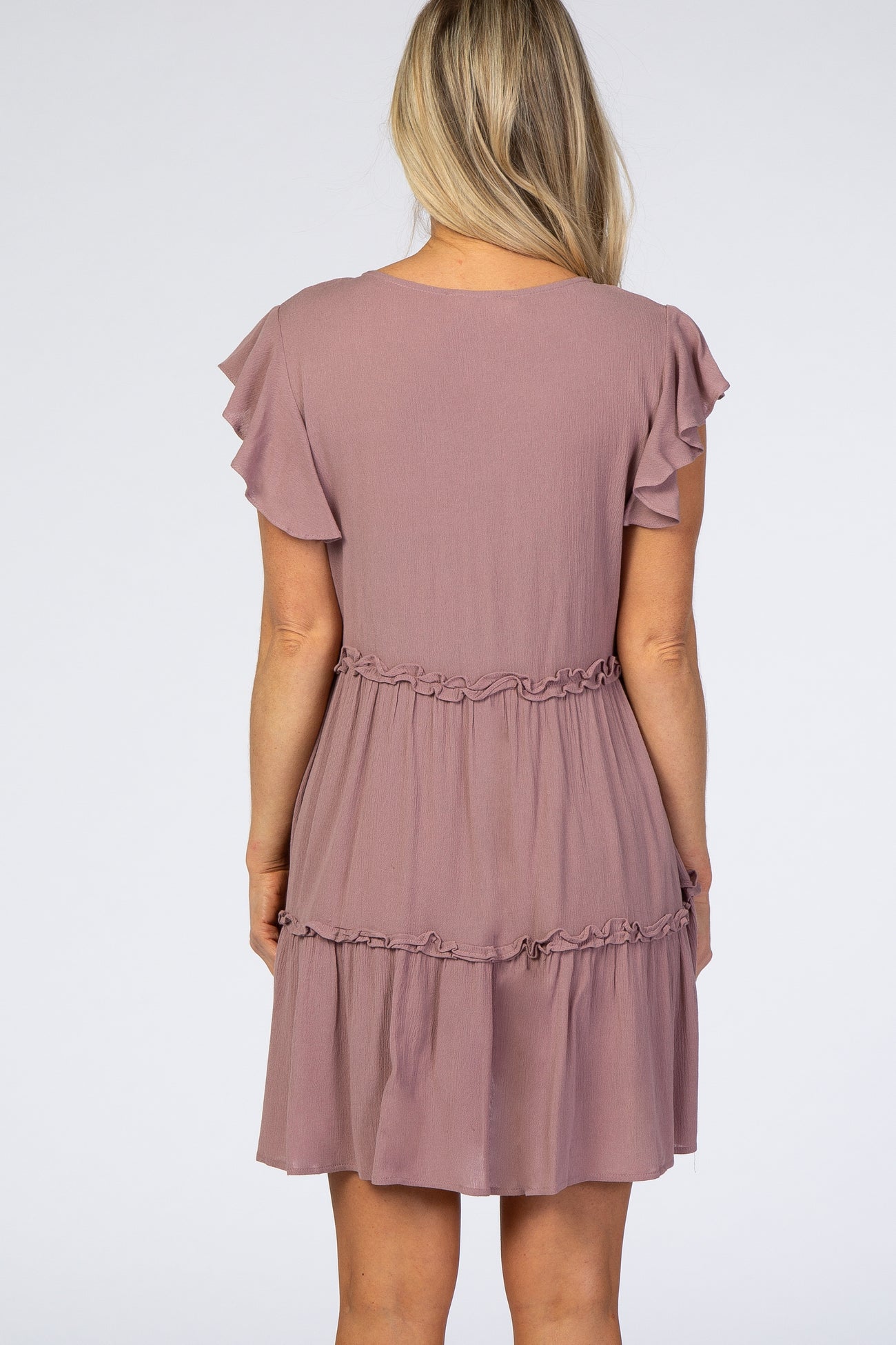 A solid hued maternity mini dress featuring short ruffle sleeves and a v-neckline.