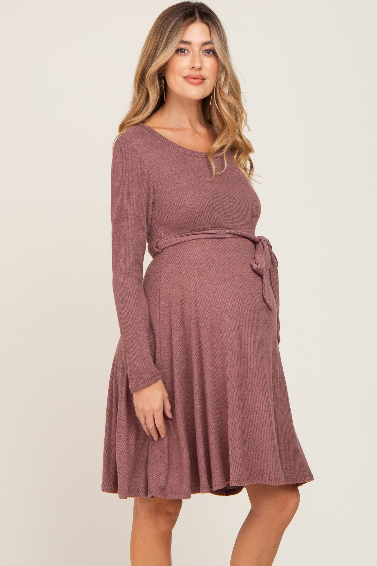 Mauve Soft Rib Knit Sash Tie Maternity Dress