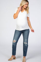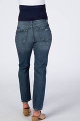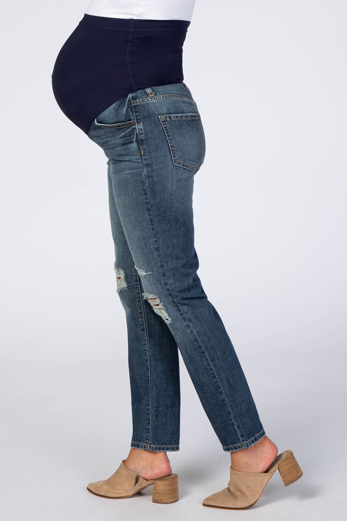 A 5-pocket maternity jean with an elastic over-belly waistband and distressing throughout. Relaxed fit.