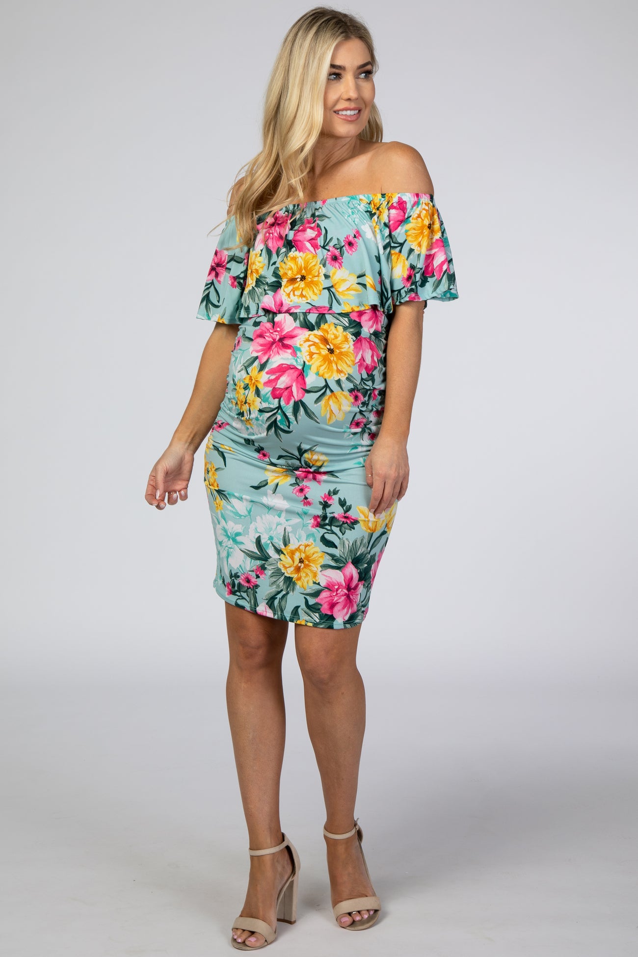 Mint Floral Off Shoulder Fitted Maternity Dress