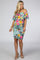 A floral print maternity fitted dress with a flounce top and side ruching.