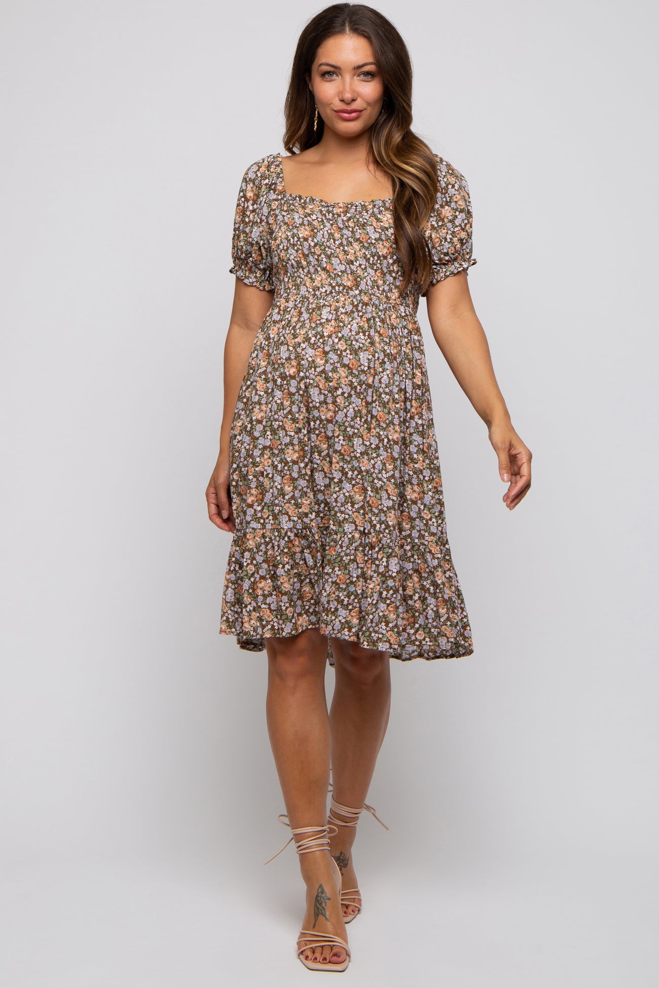 Mocha Floral Smocked Square Neck Short Sleeve Maternity Dress