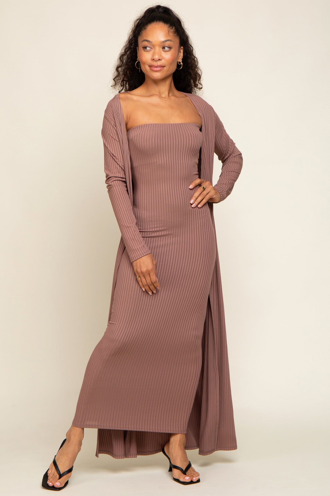 Mocha Ribbed Sleeveless Dress Cardigan Set