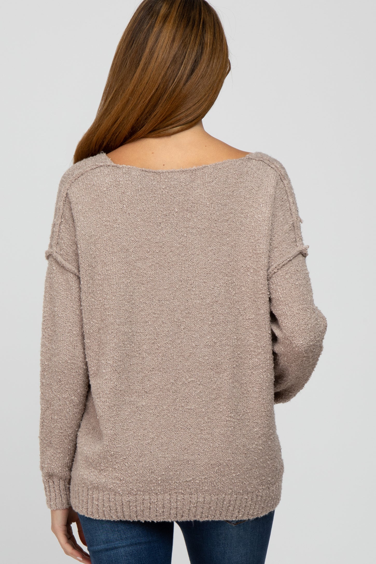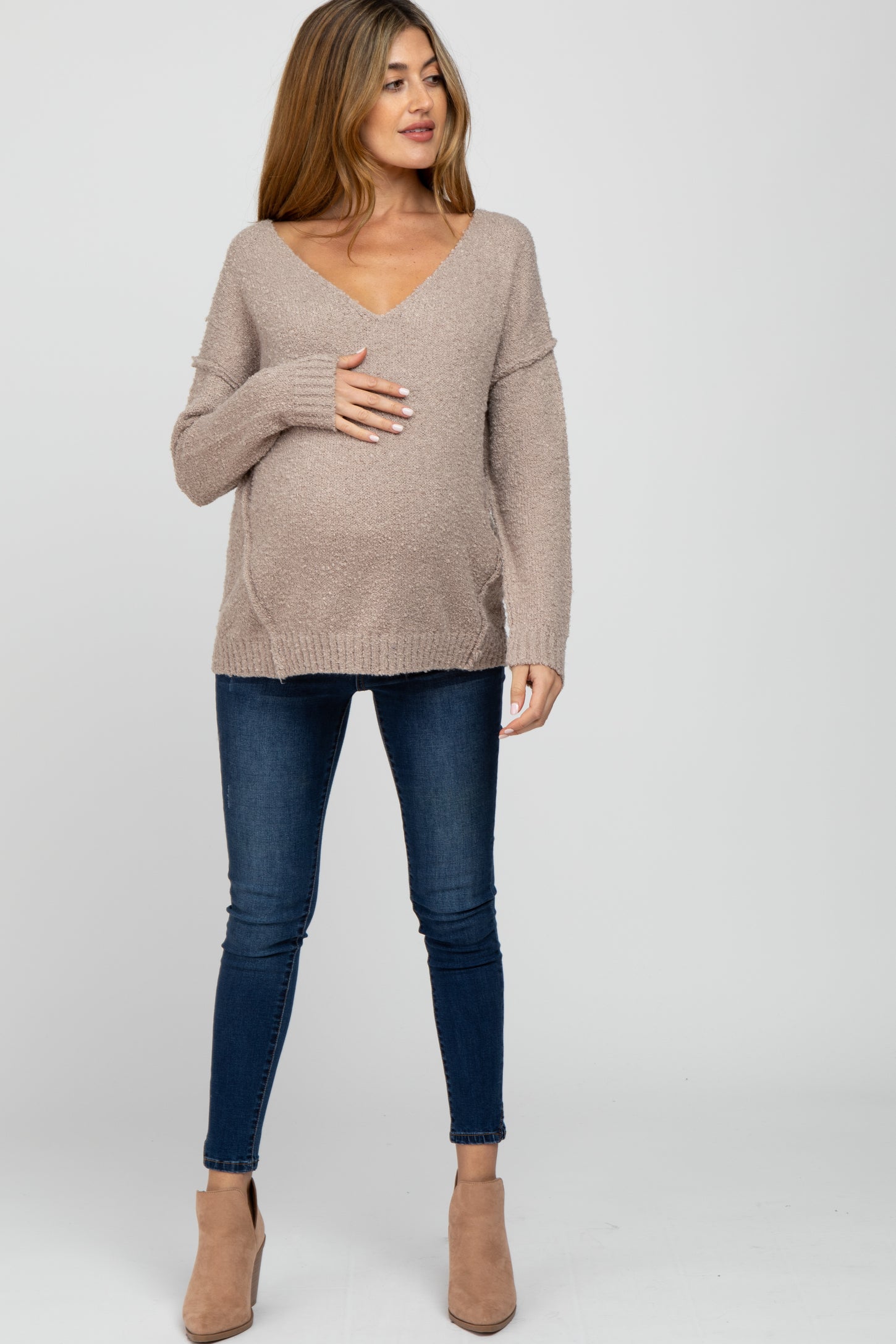 An ultra soft knit maternity sweater featuring a v-neckline, long sleeves and ribbed trim.