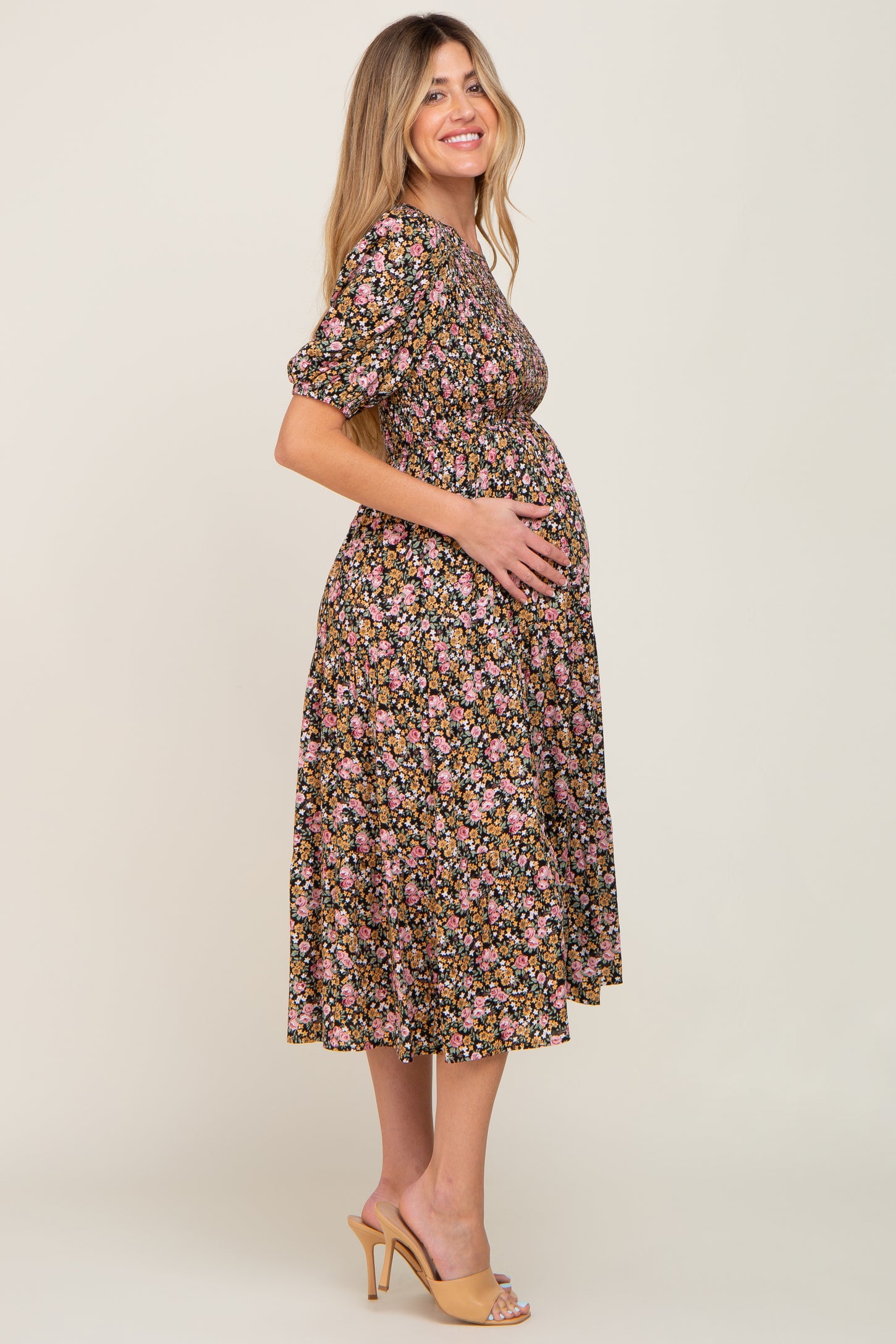 Multi-Color Floral Smocked Tiered Maternity Midi Dress
