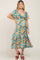 A floral print maternity midi dress featuring a wrap front v-neckline, short flutter sleeves, a smocked elastic back, a back to side cutout, a ruffle hem and double lined at the bust.