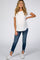 A pair of medium wash maternity jeans featuring a distressed fringe hem, five pockets and an elastic belly band. This style runs small.