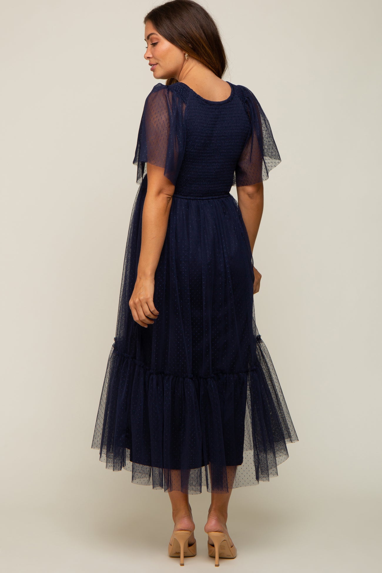 Effortlessly chic, this Dotted Tulle Smocked Maternity Midi Dress is designed to celebrate your growing bump in style. Featuring playful dotted tulle overlay, a comfortable smocked bodice, and a flattering midi length, this feminine dress gracefully transitions from brunch to baby showers. The flowy silhouette and soft lining ensure all-day comfort, while delicate flutter sleeves add a romantic touch. Easily style it with your favorite sandals or heels for a look that's both trendy and timeless. Perfect for any trimester and beyond!