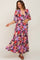 A floral print maternity maxi dress with short sleeve, deep v-neckline and tiered skirt. Hook eye closure at neckline. Dress is partially lined in skirt.