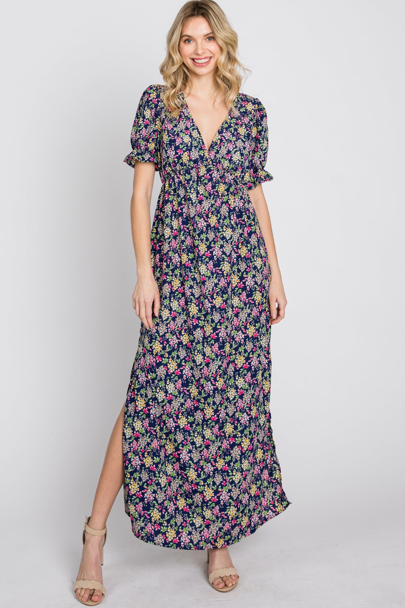 A floral print maxi dress featuring short puff sleeves, a v-neckline, an empire waist and side slits.