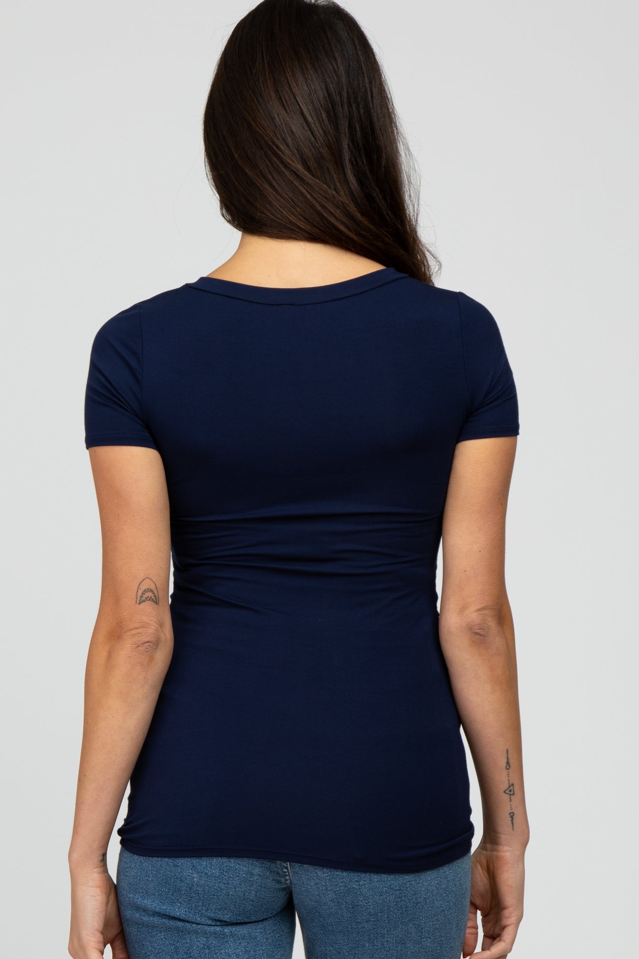 A soft knit top featuring a v-neckline, short sleeves and ruched sides.