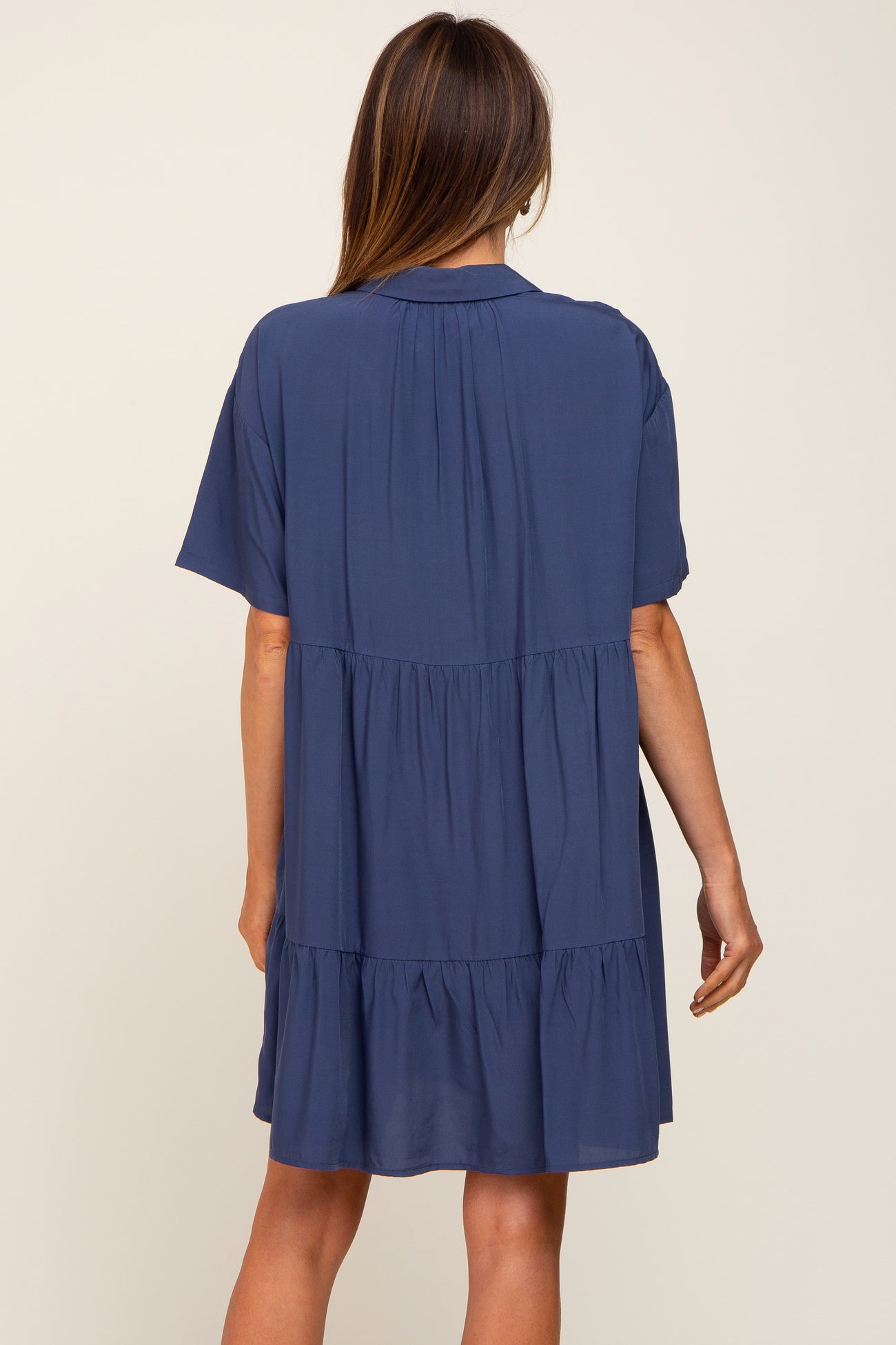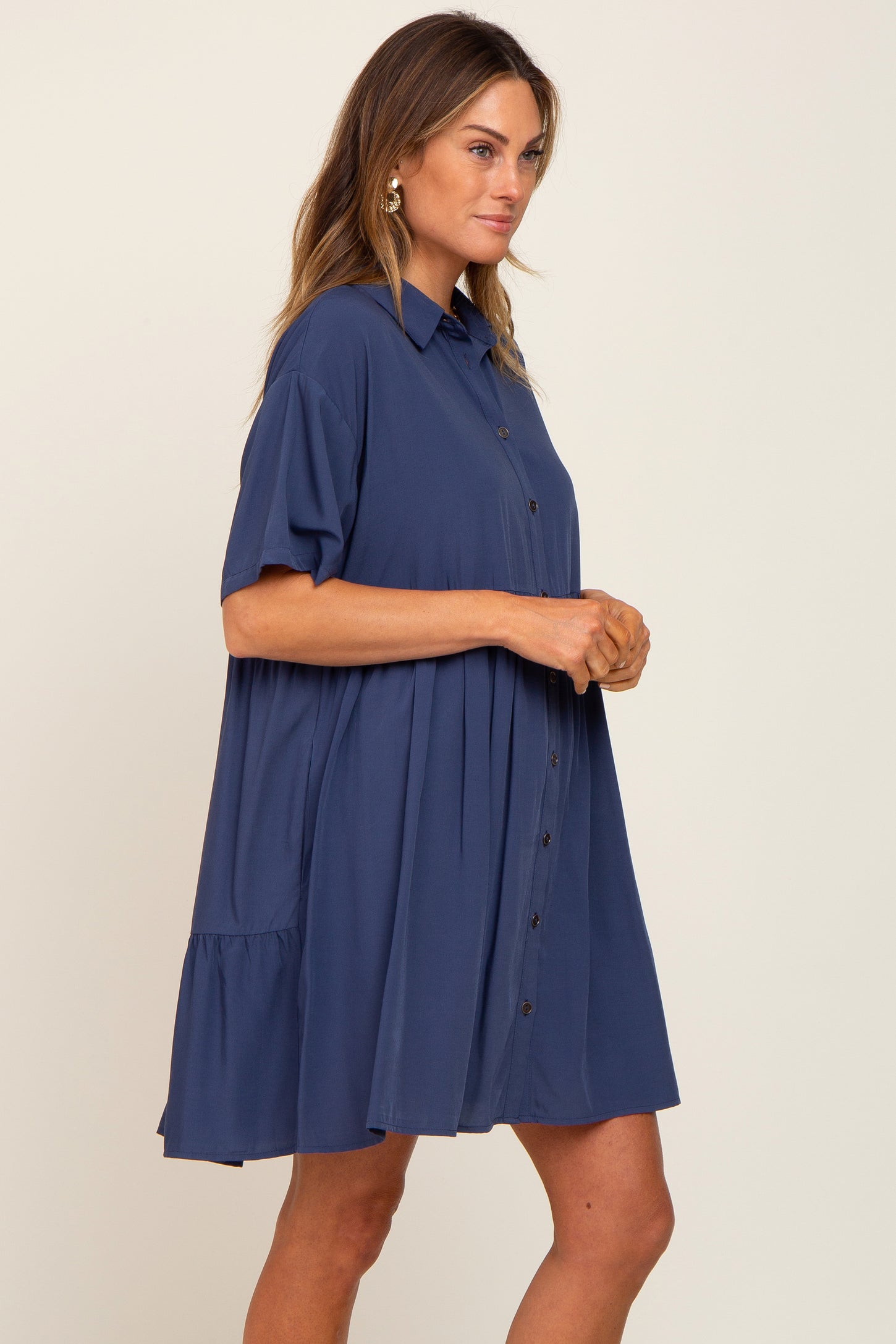 Details A solid dress featuring a collar, front functioning buttons, shirring at the waist, and side pockets. Content + Care