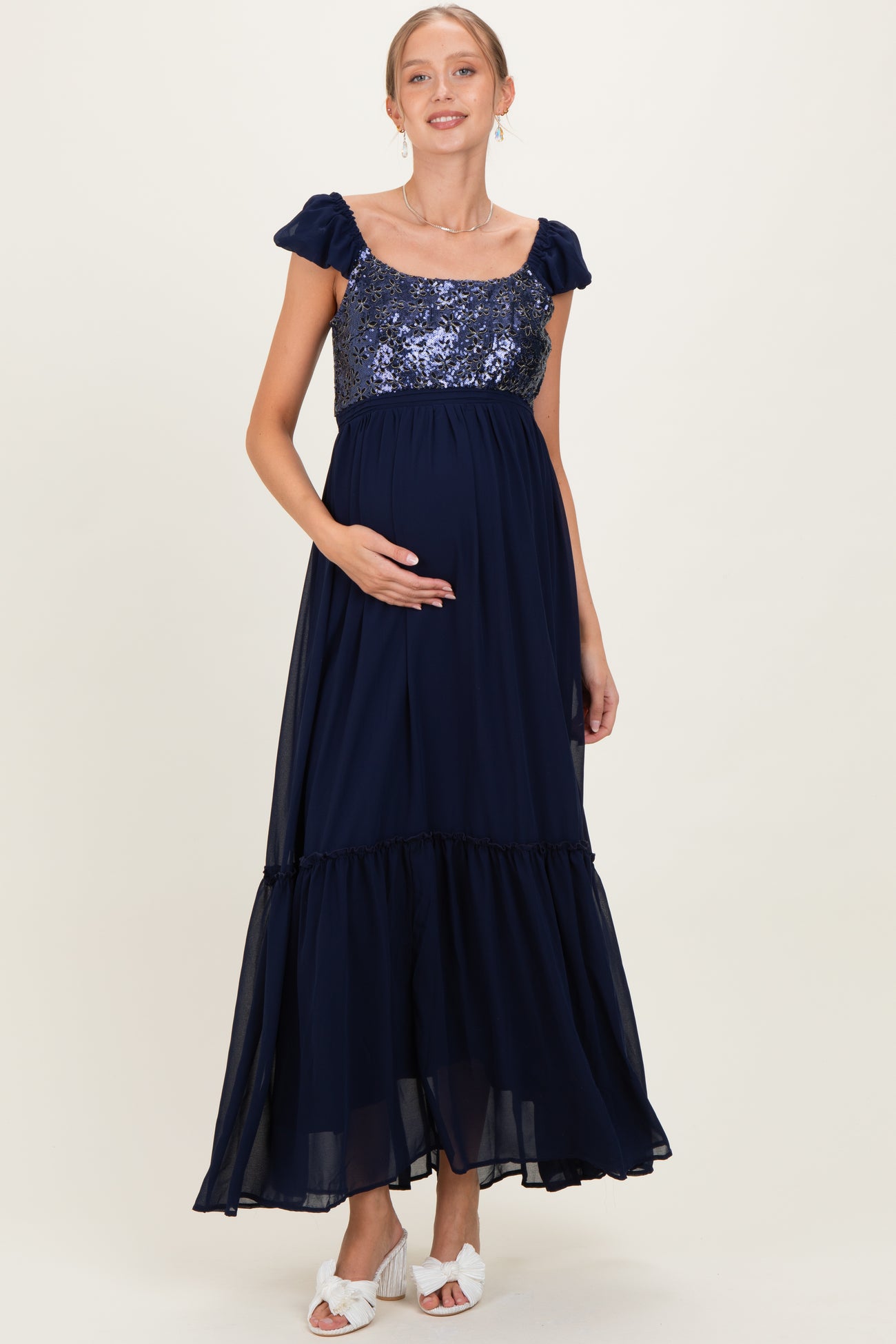 Navy Chiffon Sequin Bodice Maternity Maxi Dress